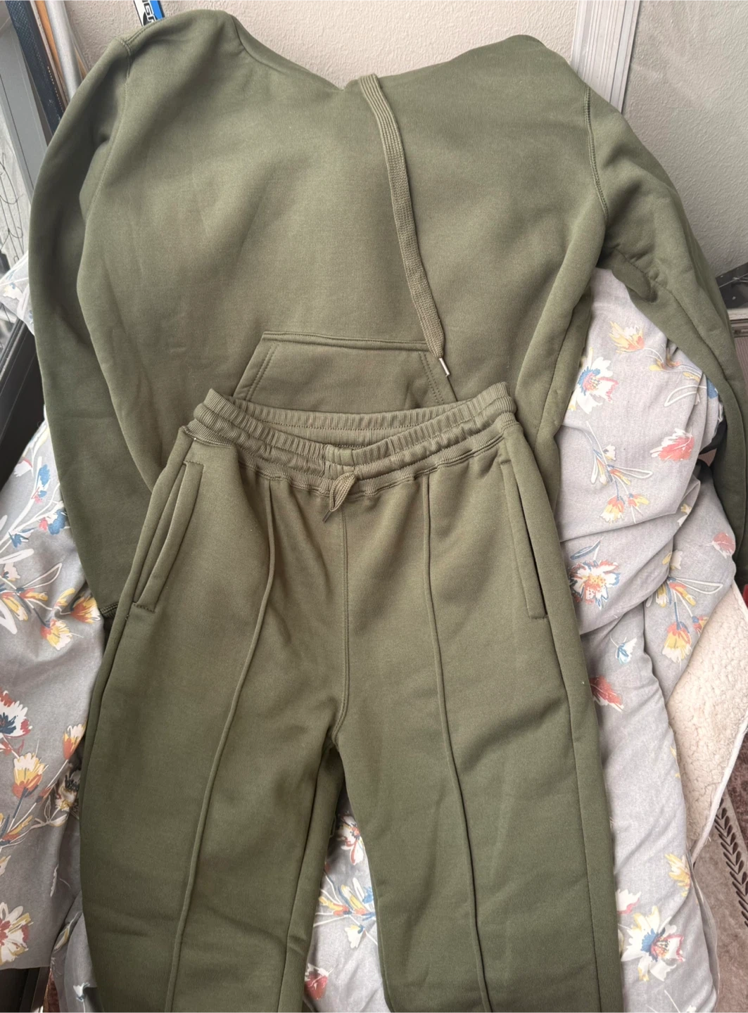 Selling a comfy hoodie and sweatpants set in a nice green colour. Perfect for lounging around the house or running errands. The material feels soft and cozy!