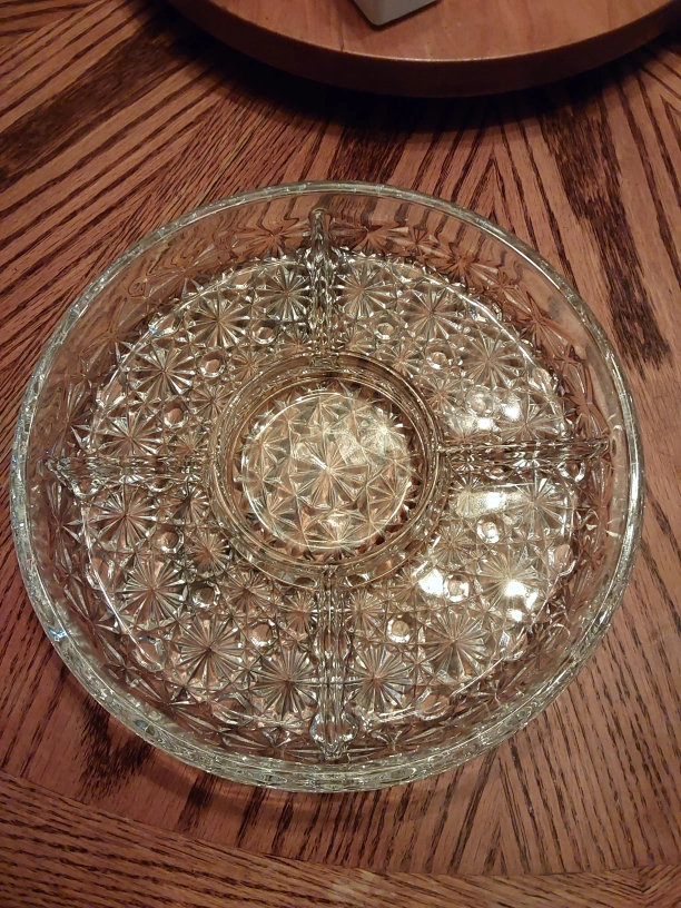 Selling a lovely clear glass serving dish! It has a beautiful starburst pattern and a divided design, perfect for serving snacks or appetizers at your next get-together