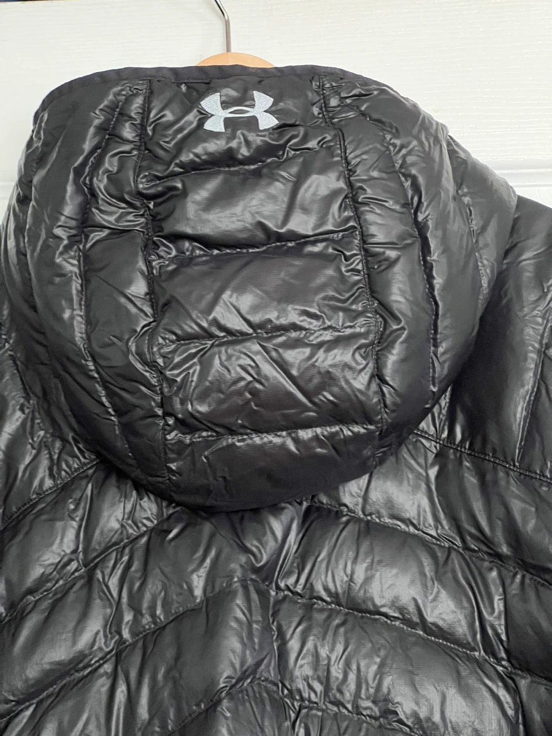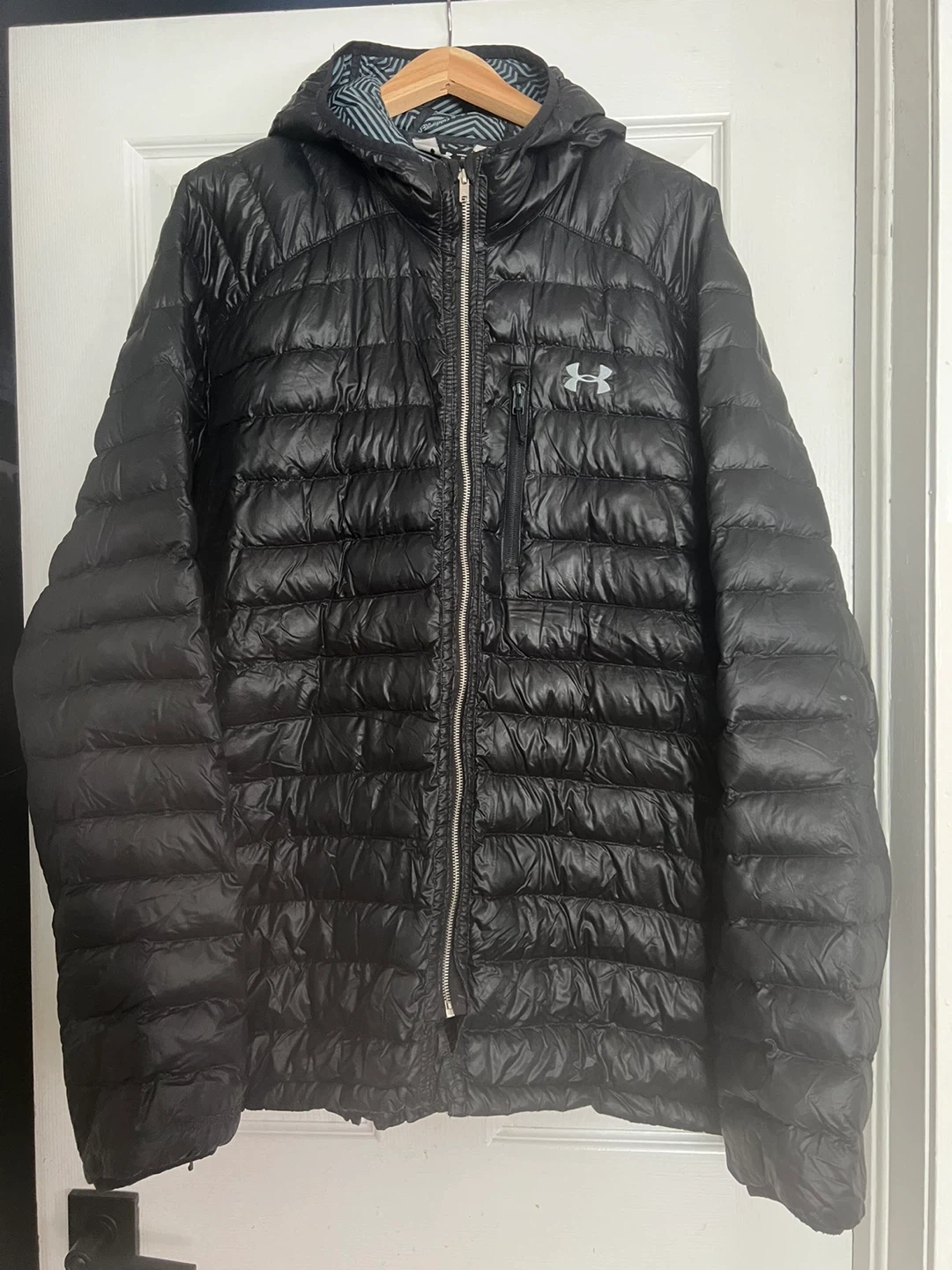Selling a black puffer jacket from Under Armour. It's in great condition and perfect for staying warm during colder weather. The jacket features the Under Armour logo and a lightweight design. It has a zipper and a hood.