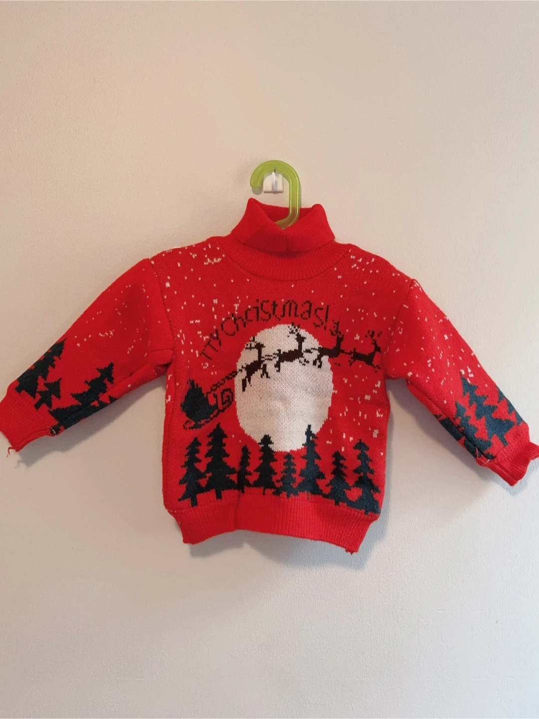 Toddler girls 4T. It features a festive design with Santa, reindeer, and Christmas trees. The sweater is in great condition and has a cozy, soft lining. Perfect for keeping your little one warm and stylish during the holiday season!