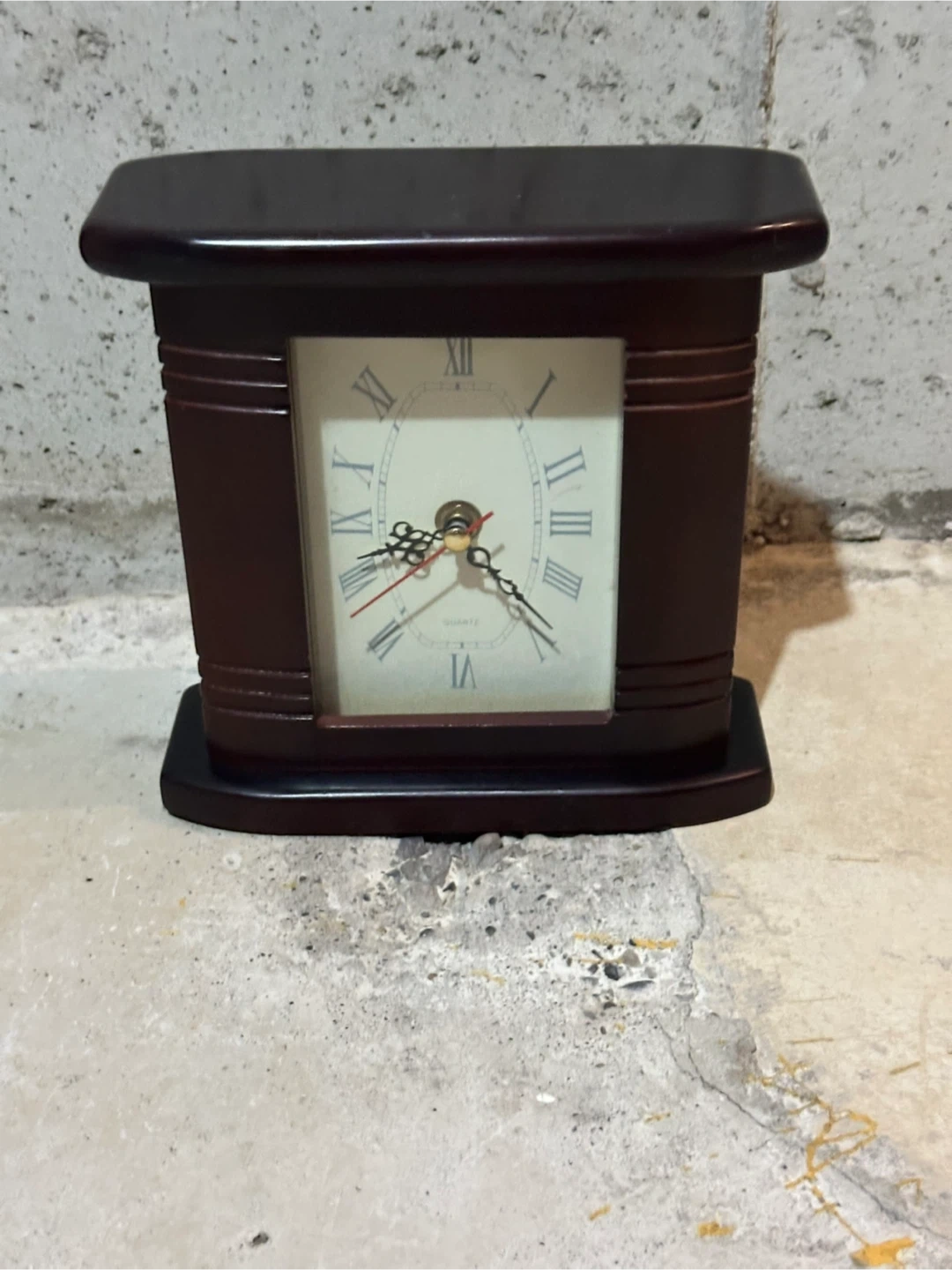 Selling a wooden table clock. It has a classic design with Roman numerals. Great for a desk or shelf! With picture on the back.