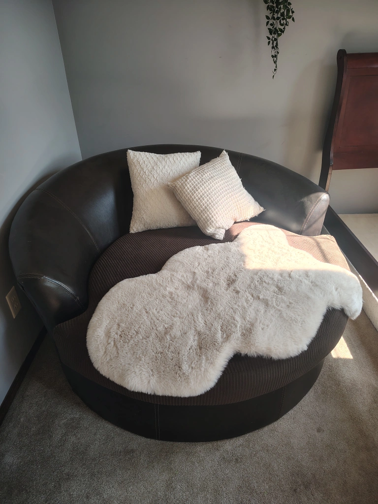 Selling a cozy round accent chair, perfect for adding a comfy touch to any room! It comes with two decorative pillows and a soft, faux sheepskin rug to complete the look. The chair is in great condition and ready to find a new home