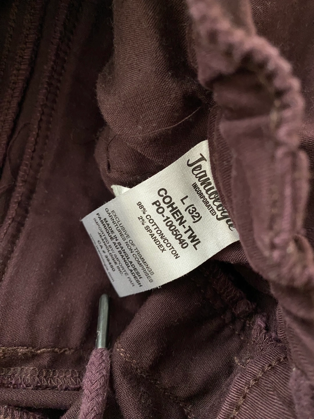 DNM WORKS cargo pants in size L (32). They are a stylish burgundy colour and made of 98% cotton and 2% spandex. They are in great condition!