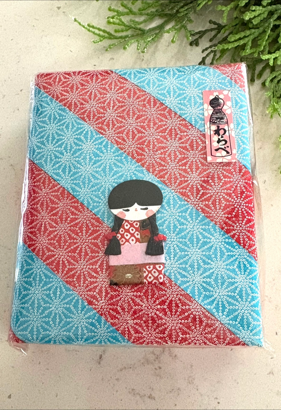 The book is wrapped in a unique patterned cloth and features a cute doll design.