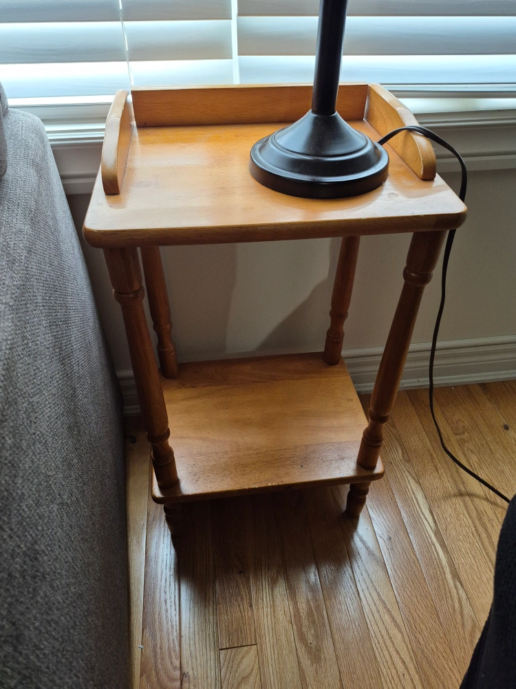 Selling a cute wooden side table! Perfect for next to a couch or bed. It has a top surface and a bottom shelf for extra storage or decor