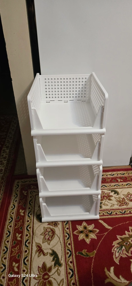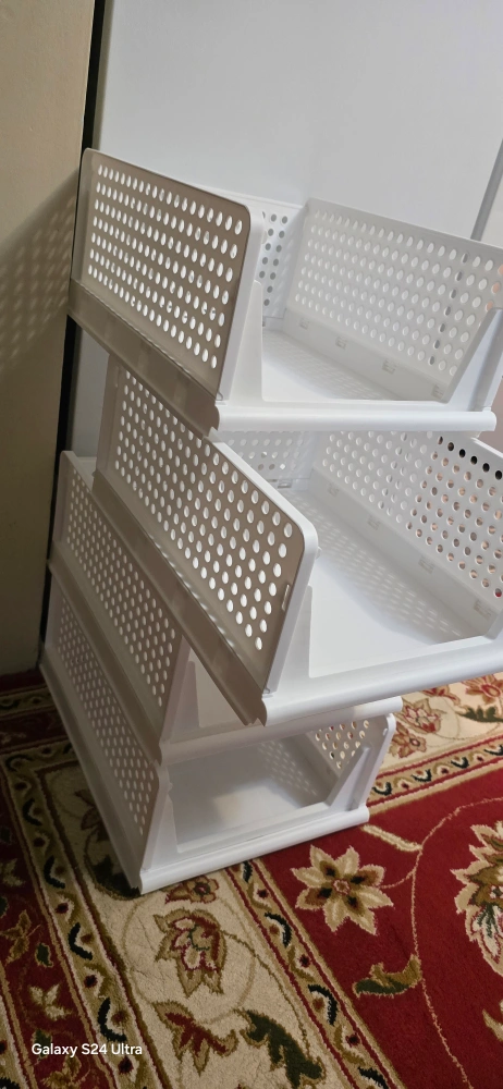 I'm selling a set of stackable storage baskets! These are great for organizing items in your closet, pantry, or any room in the house. They're made of durable white plastic and are in excellent condition. Perfect for decluttering and keeping things tidy!