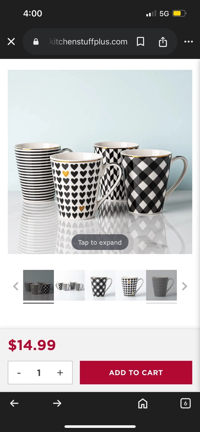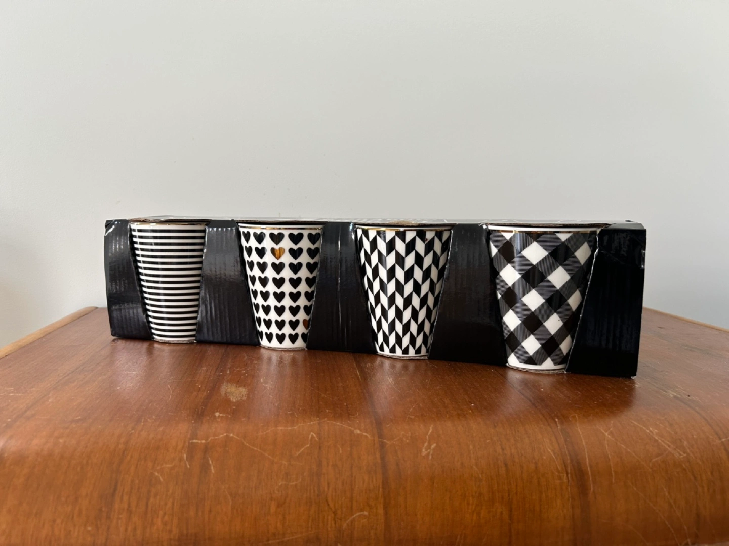 Brand new in box, this Graphic 4-piece mug set is made of new bone china. It features a variety of black and white patterns, including stripes, hearts, and checkered designs. The original price was $14.99.
