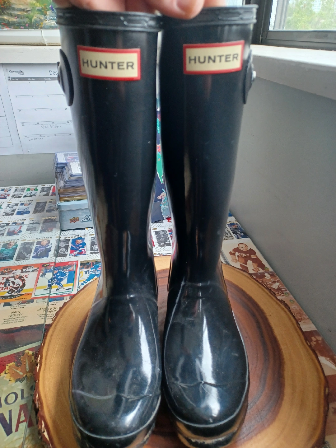 Selling a pair of classic black Hunter rain boots! They're in great shape and ready to keep your feet dry on those rainy days. Perfect for walking the dog or running errands around town