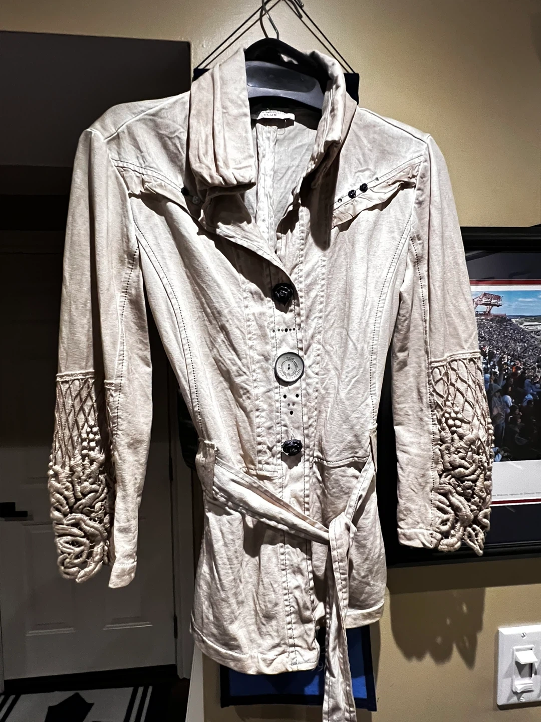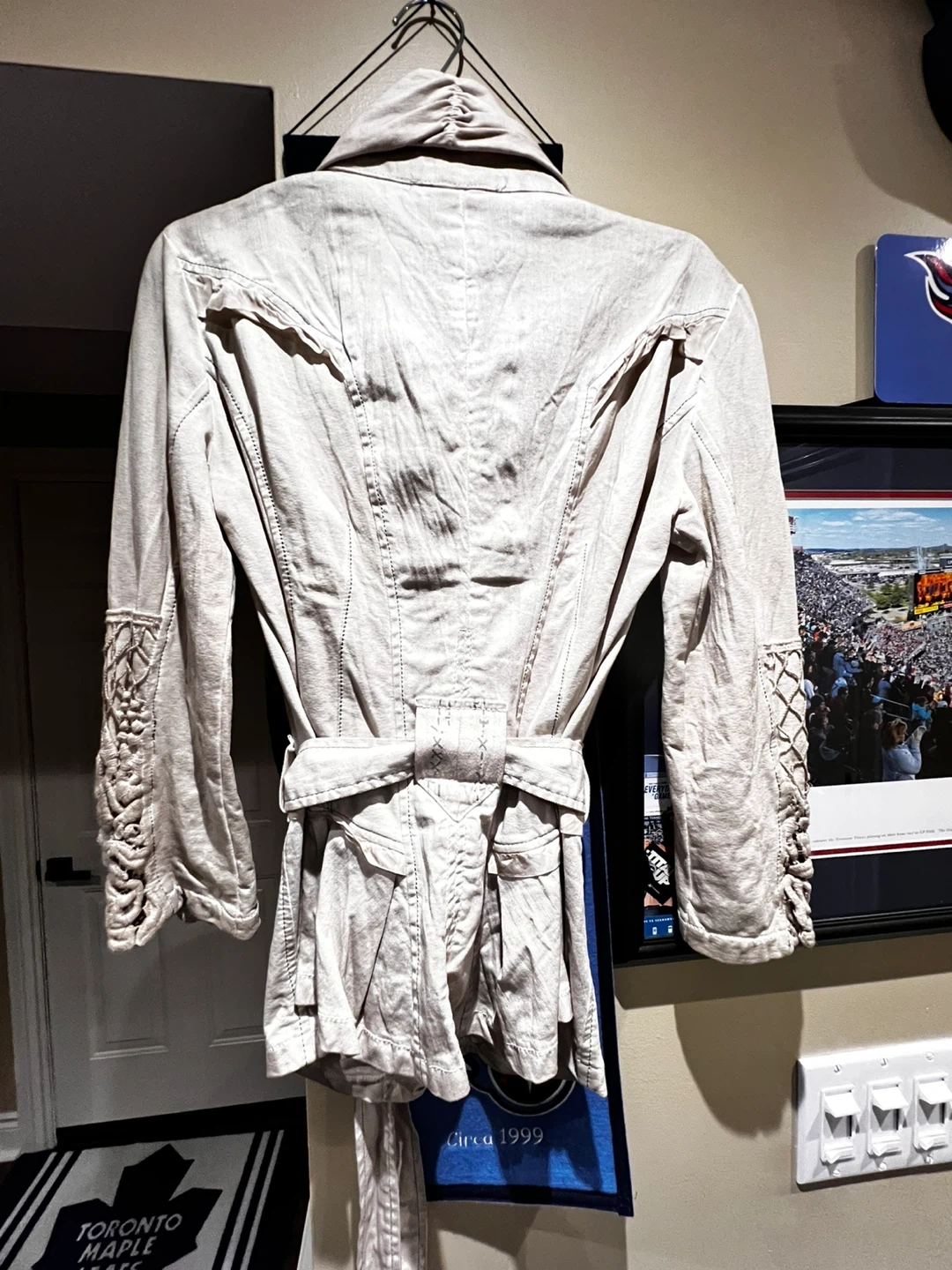 Selling a beautiful Elisa Cavaletti Club jacket in a neutral beige colour! It's made in Italy and features unique detailing on the sleeves and back. The jacket also has a belt to cinch the waist. It's in excellent condition and ready for a new home