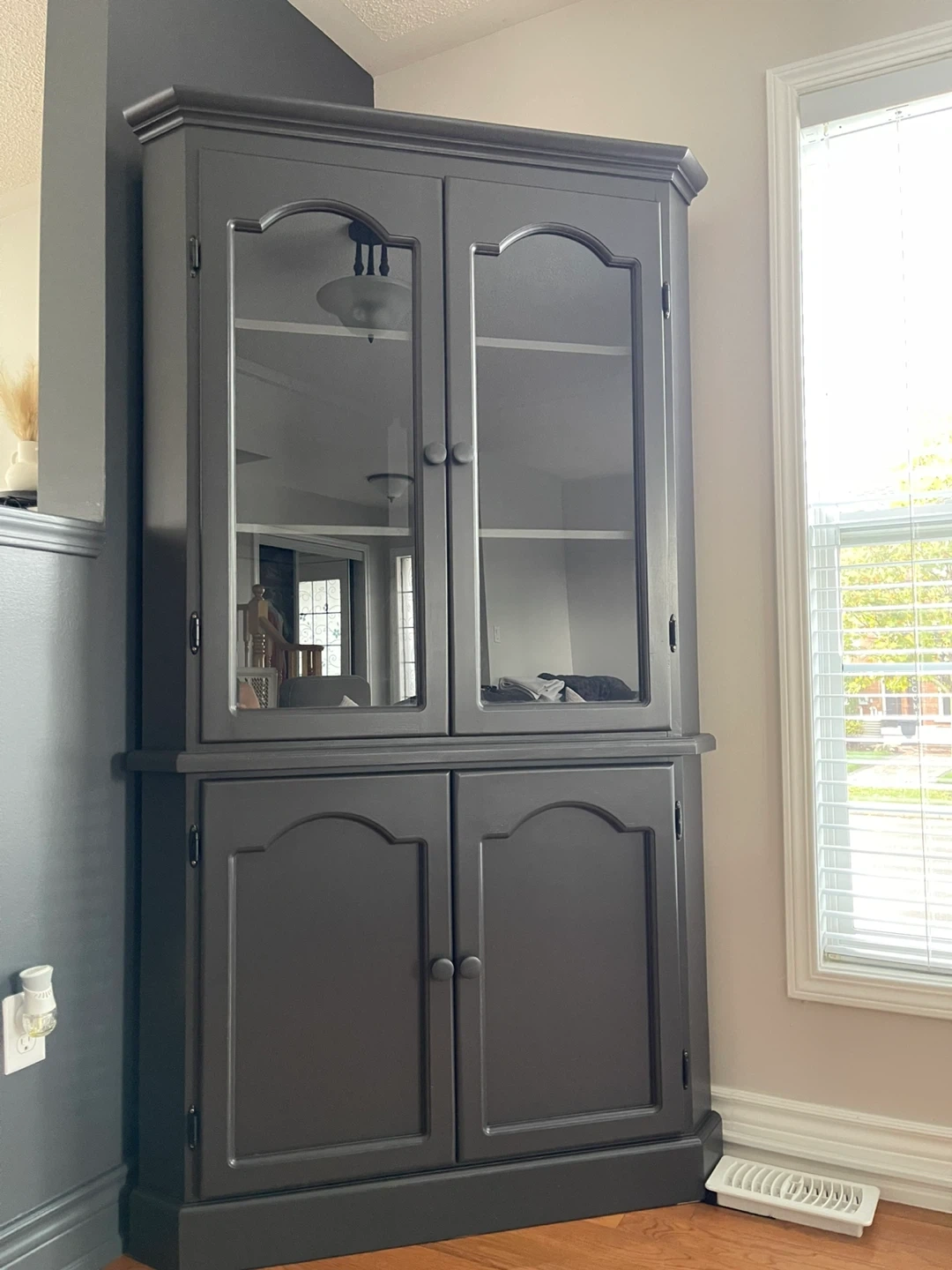 Selling a display cabinet in a dark grey colour. It features glass doors on top and solid doors on the bottom. Perfect for displaying your favourite items or storing things away neatly!