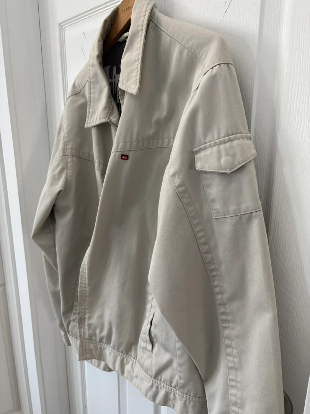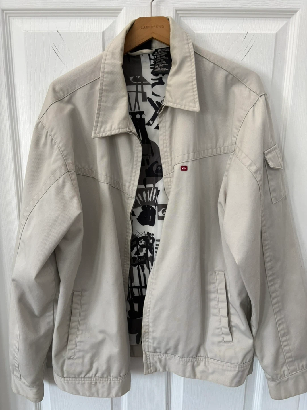 20Selling a Quiksilver beige jacket in good condition. It features a unique black and white patterned lining and several pockets, perfect for everyday wear!