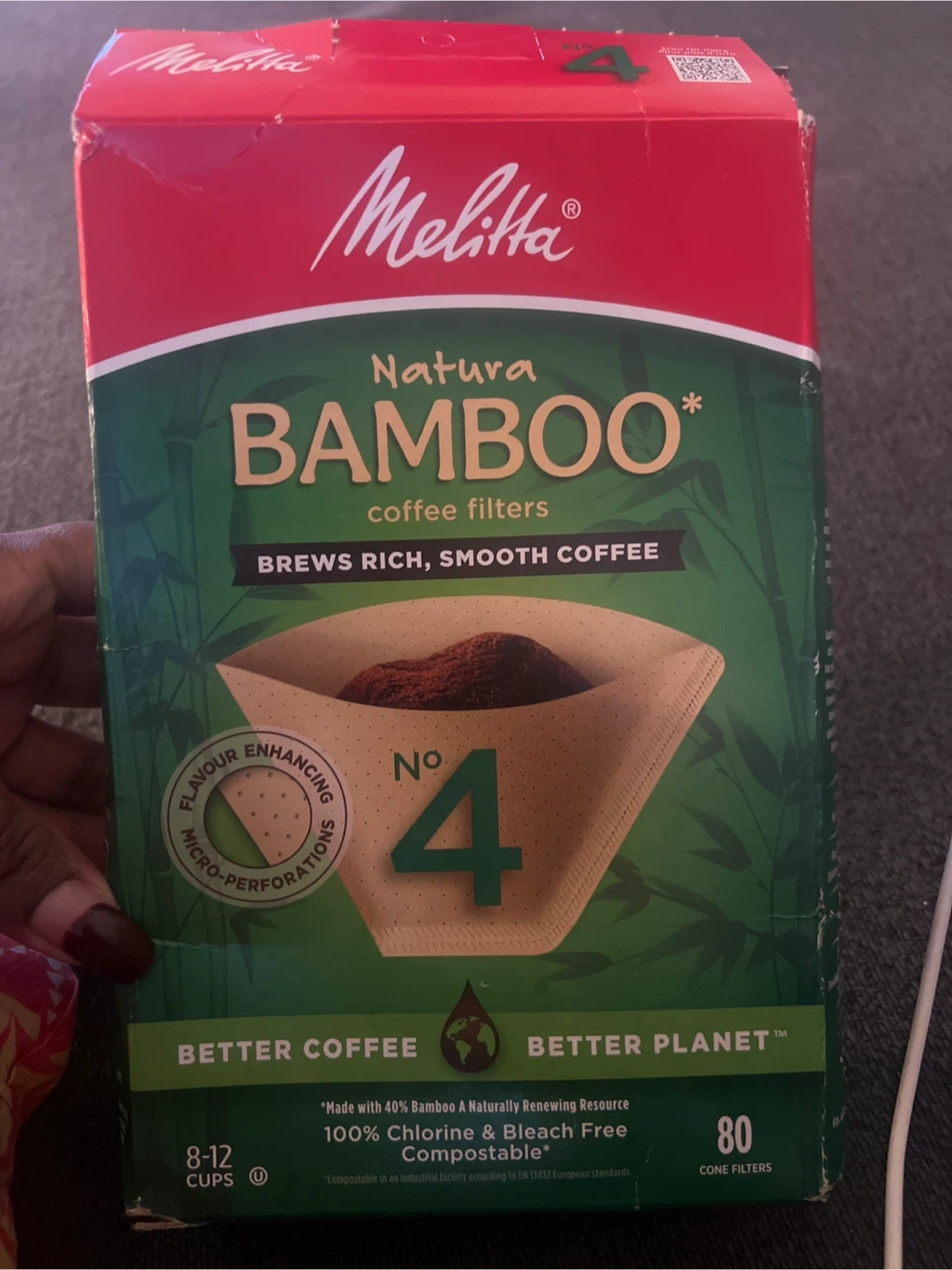 a box of Melitta Natura Bamboo coffee filters, size #4. These filters are made with 40% bamboo, a naturally renewing resource, and are 100% chlorine and bleach-free! The box contains 80 cone filters. Brews rich, smooth coffee!