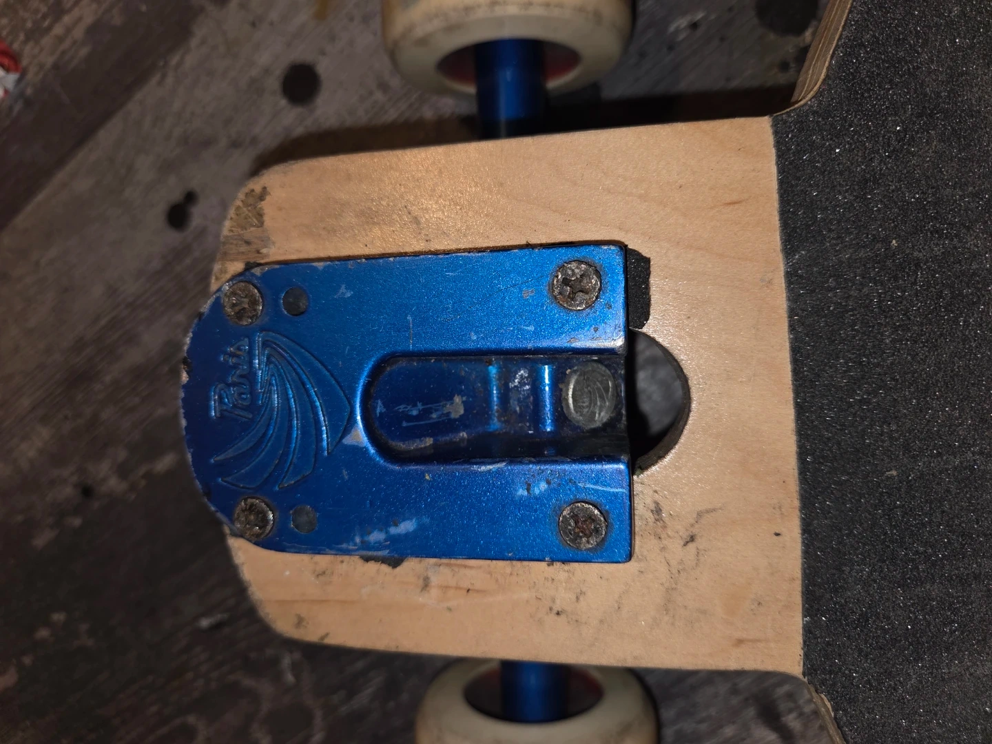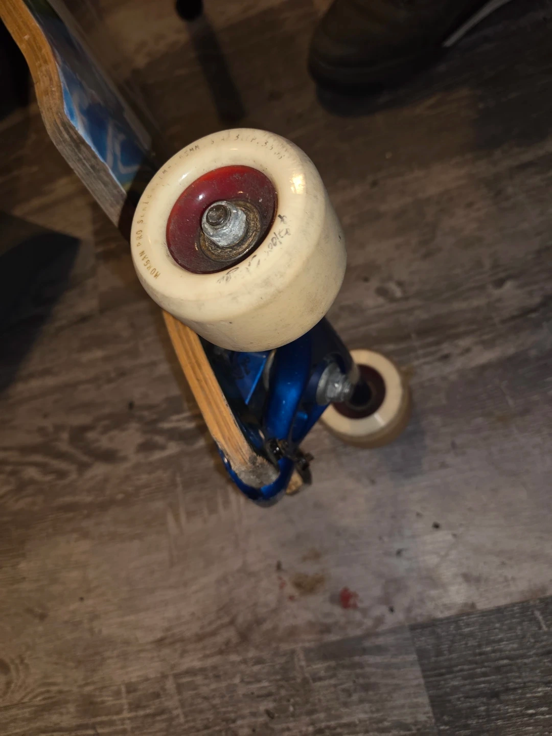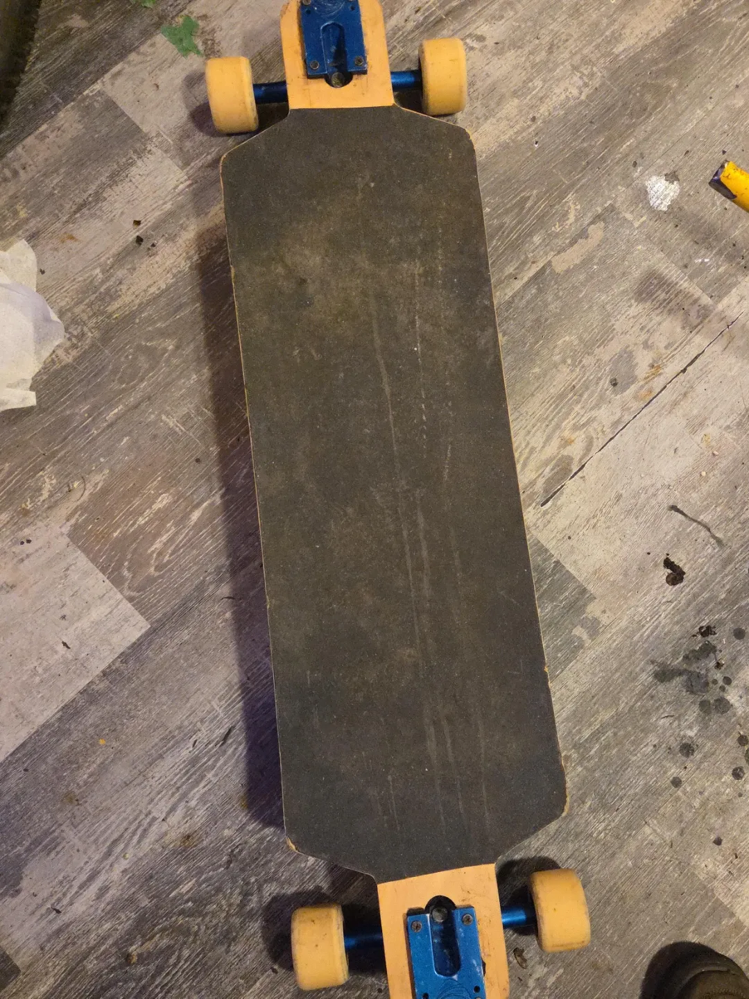 This Santa Cruz longboard features a Mob Grip deck. The trucks are blue, and the wheels are a creamy yellow. It's a solid board for cruising around town!