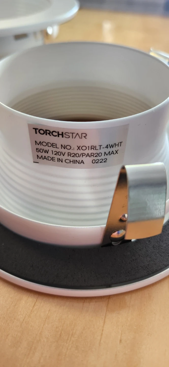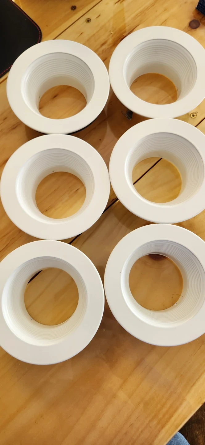 Set of recessed lighting trim fixtures. Model number X01RLT-4WHT supports up to 50W, 120V. White colour finish. These are for indoor use. Pack of 6