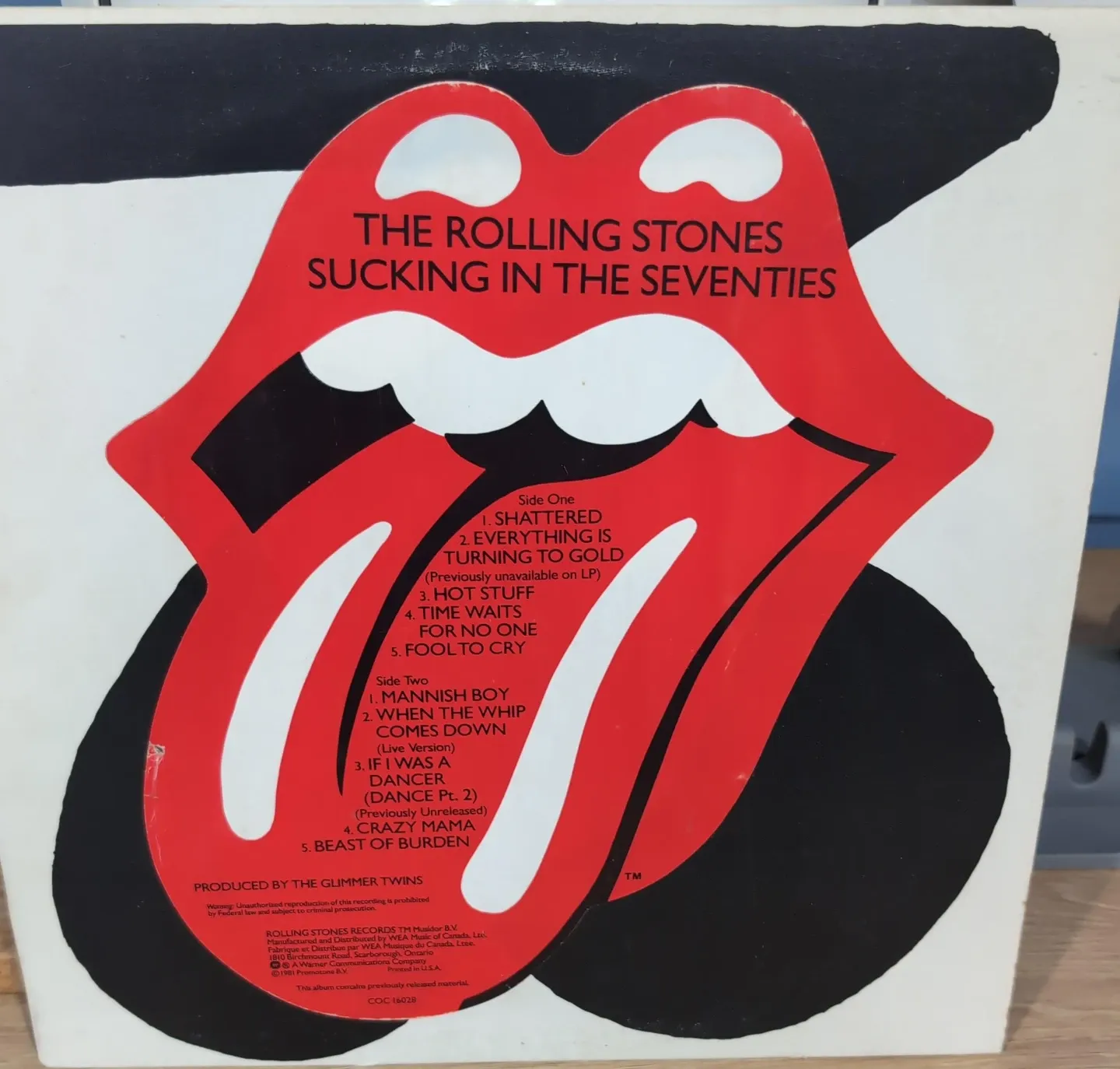 This is a vinyl LP record by The Rolling Stones titled 'Sucking in the Seventies'. It features tracks like "Shattered" and "Everything is Turning to Gold". The record is in good condition.