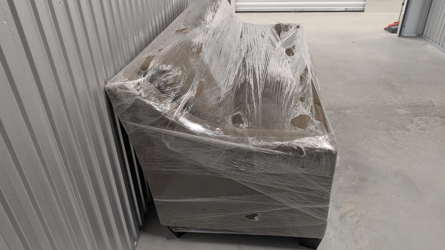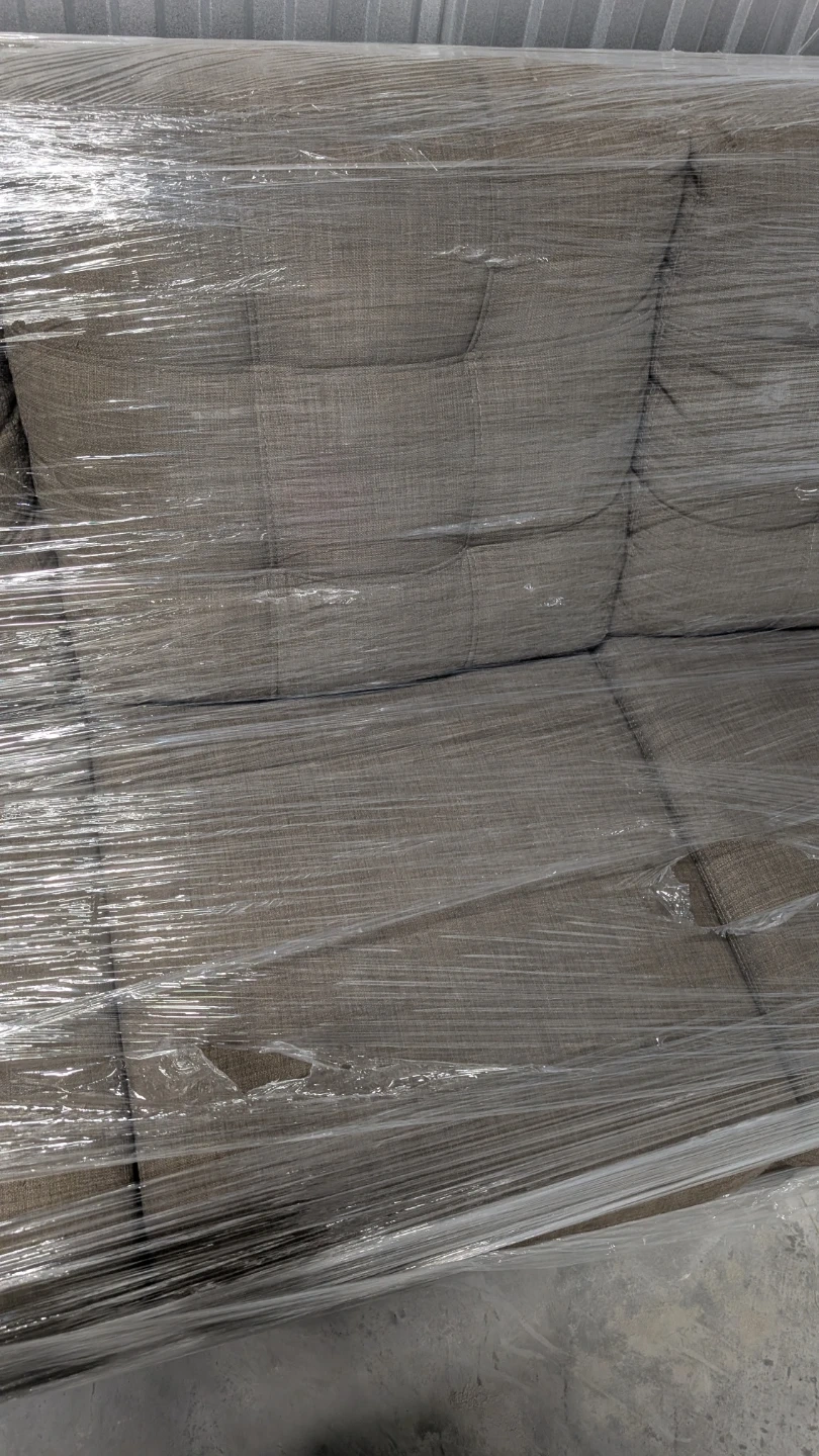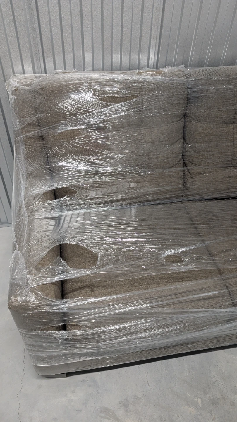 This is a brown fabric sofa almost like new covered with plastic safely kept on storage. It has two integrated cup holders. Great for living room or den