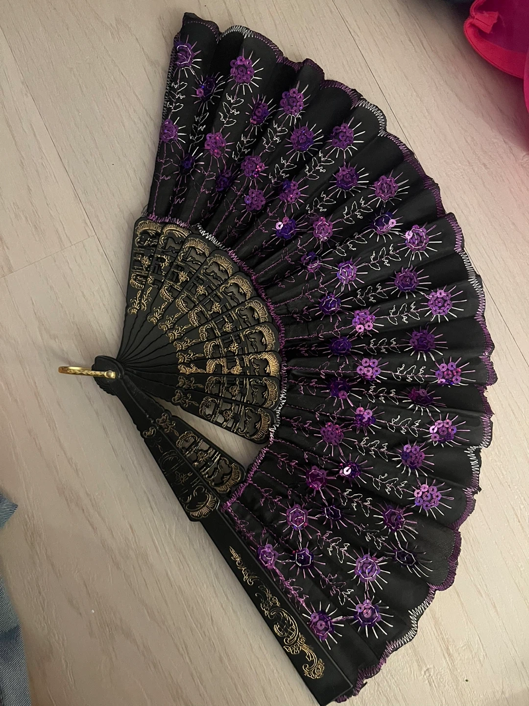 Beautiful black hand fan featuring delicate purple flower designs. It's in good condition and perfect for adding a touch of elegance to any occasion! The fan has gold detailing on the handle and frame.