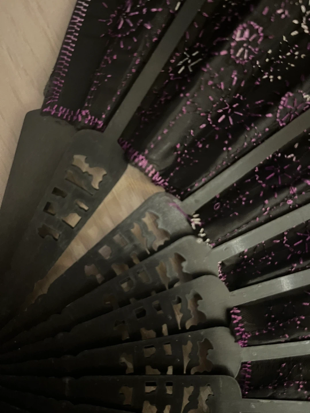 Beautiful black hand fan featuring delicate purple flower designs. It's in good condition and perfect for adding a touch of elegance to any occasion! The fan has gold detailing on the handle and frame.