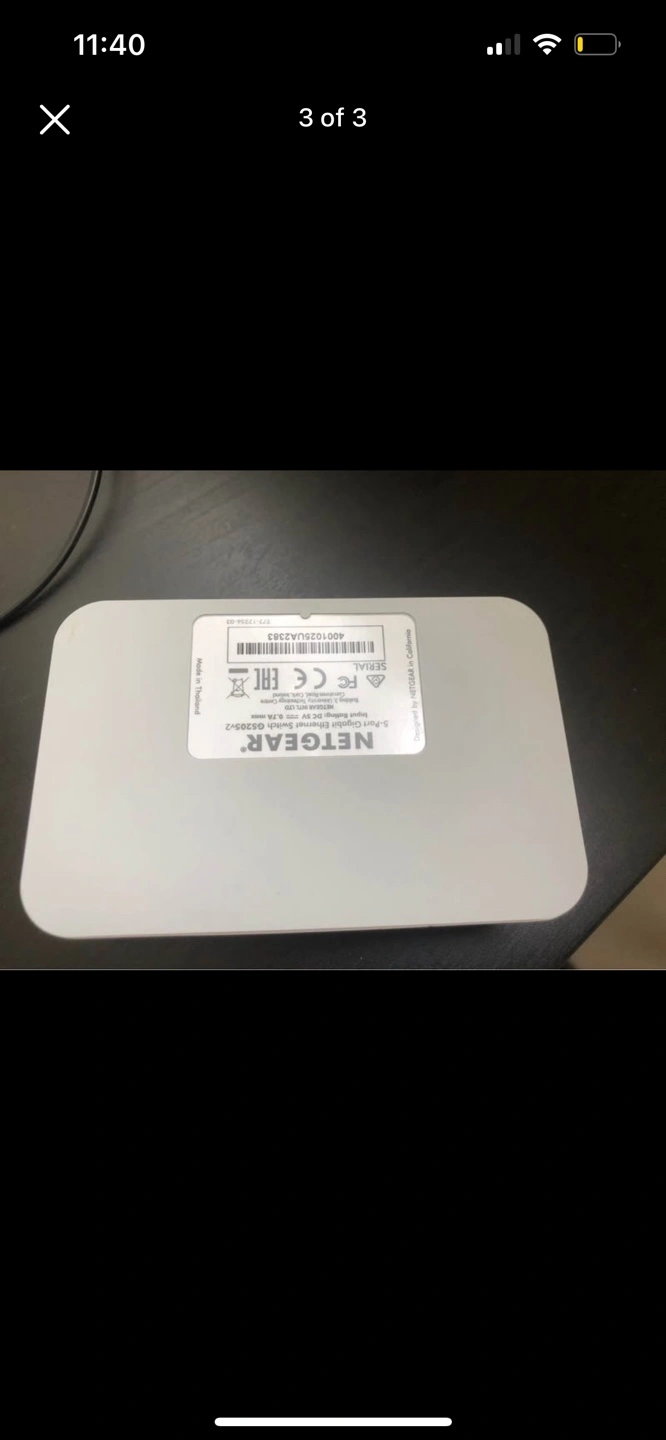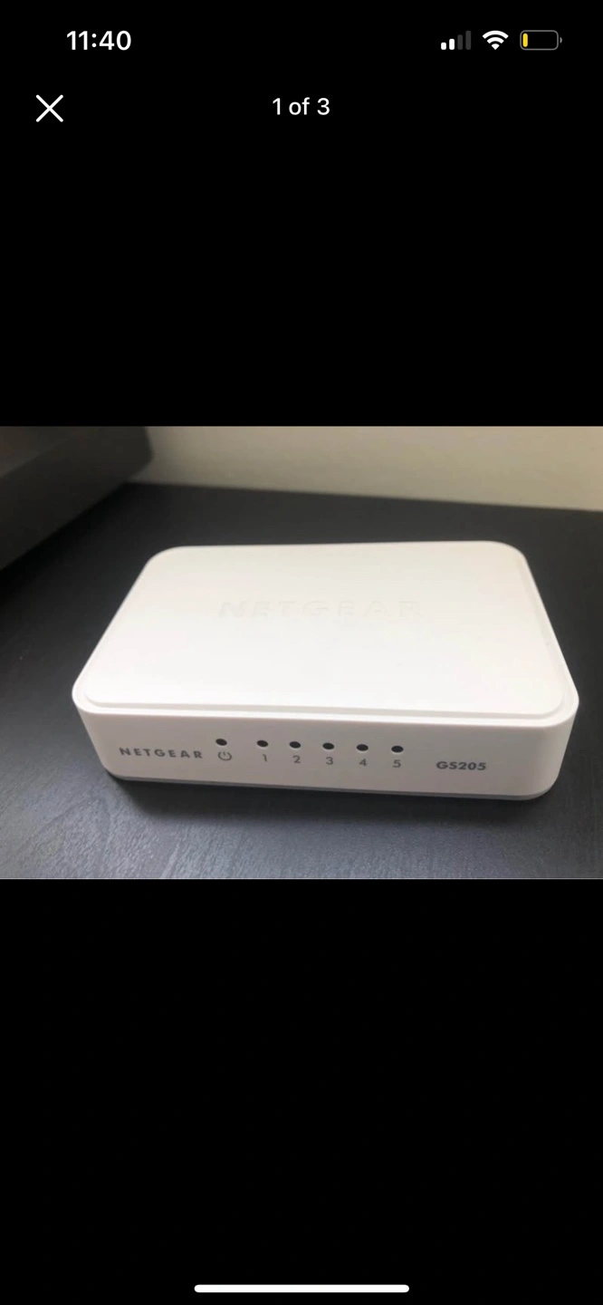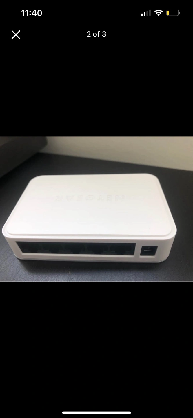 White 5-port ethernet switch. Compact design. Good for home or small office use. Simple setup.