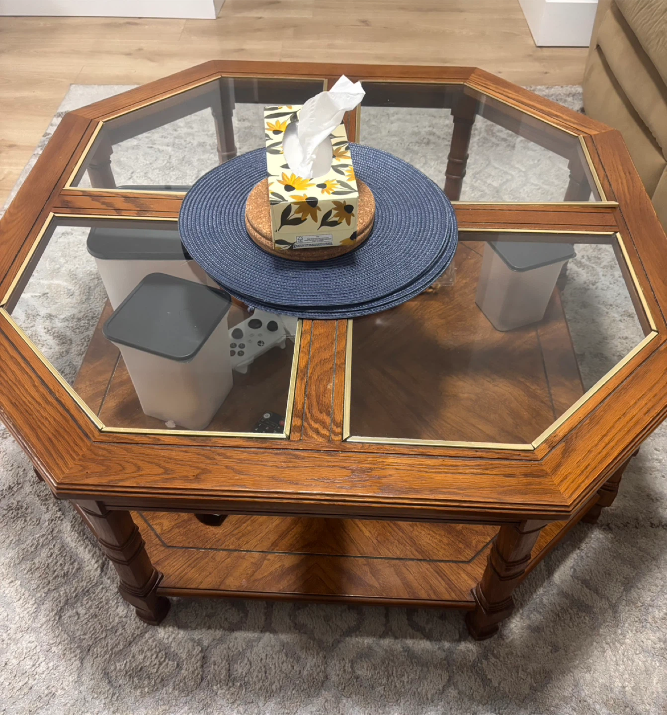 Recliner Sofa set along with This octagonal coffee table features a durable wooden frame and a clear glass top. It has a lower shelf for additional storage. A stylish and functional addition to any living room!