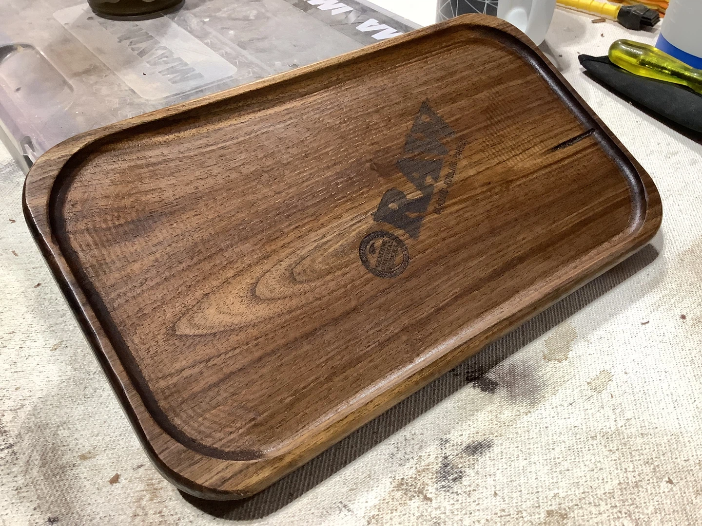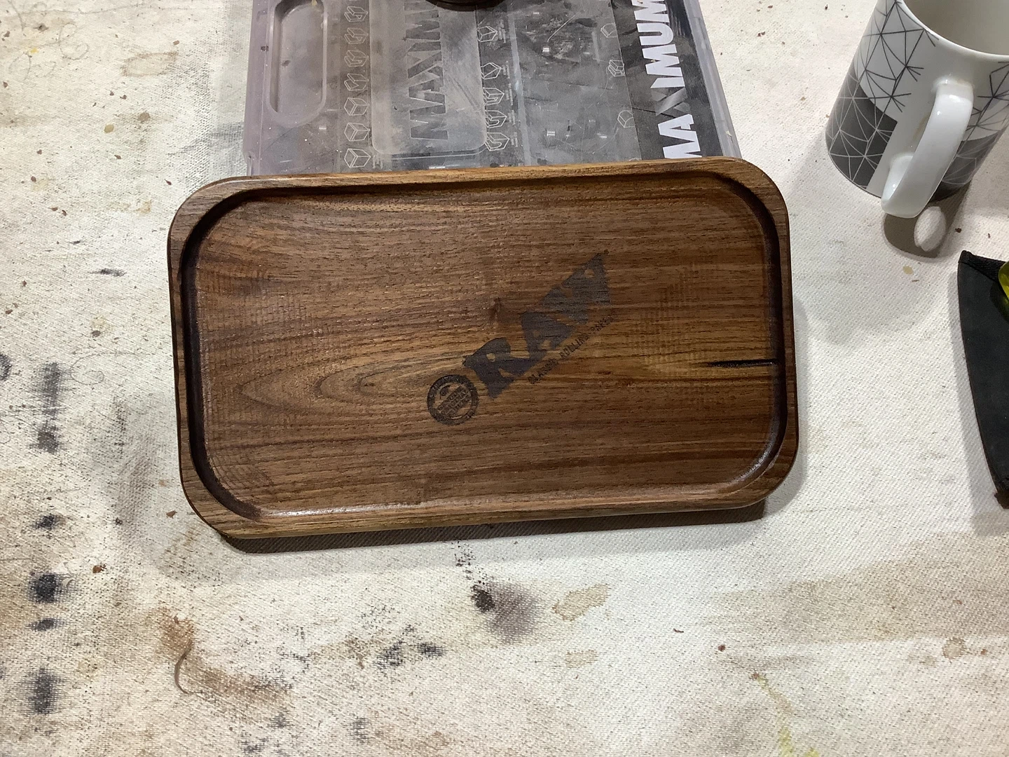 This is a RAW rolling tray made of dark walnut wood. It's a handy size for rolling. This tray is great for keeping your supplies organized.