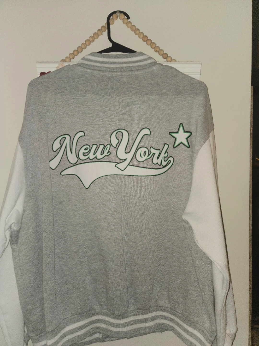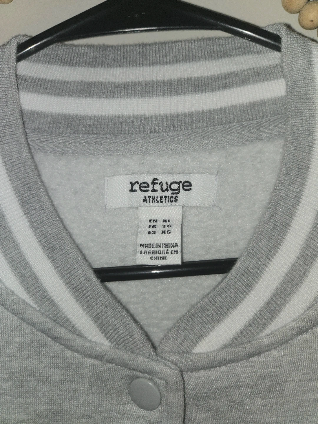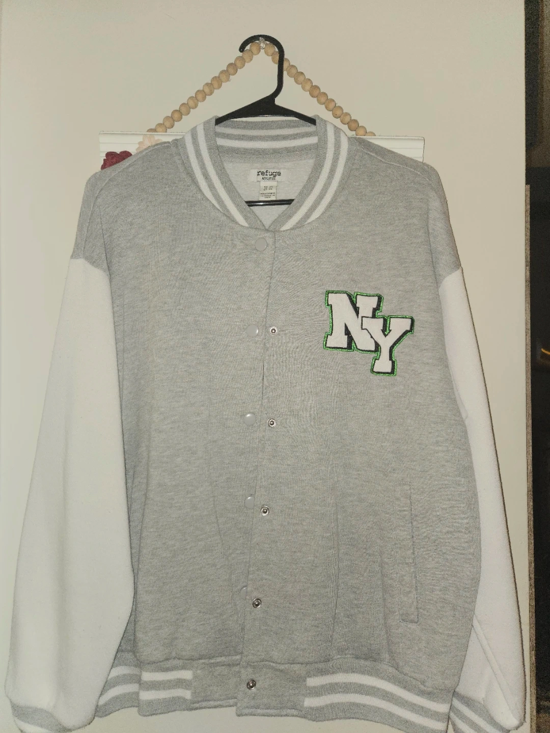 Grey and white "New York" letterman jacket from Refuge Athletics. It's a size XL. This jacket has the "NY" logo on the front and "New York" script on the back. Great for casual wear!