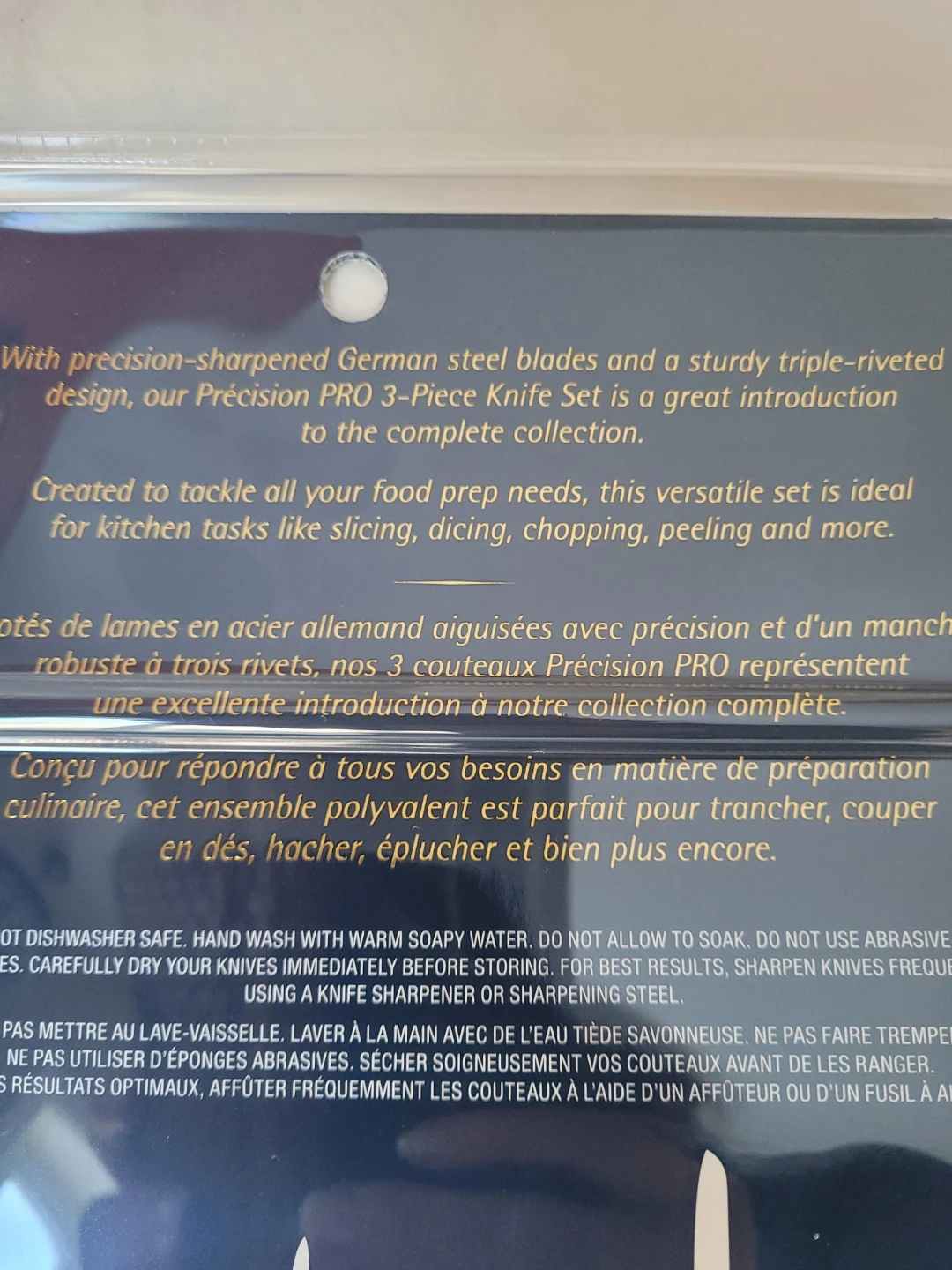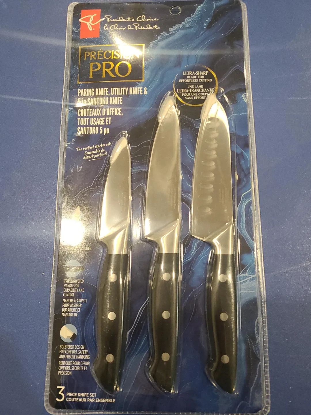 NEW! This Precision Pro 3-piece knife set features German steel blades and a triple-riveted design. It's great for kitchen tasks like slicing, dicing, and chopping. The set includes a paring knife, utility knife, and a 5-inch Santoku knife.
