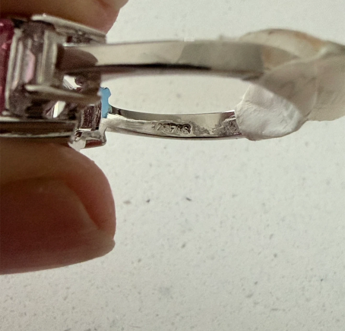 A lovely three-stone ring featuring a large princess-cut 9.49 pink Cubic Zirconia, flanked by two rectangular white gemstones. The band is Sterling silver-toned and has a marking of '925'.