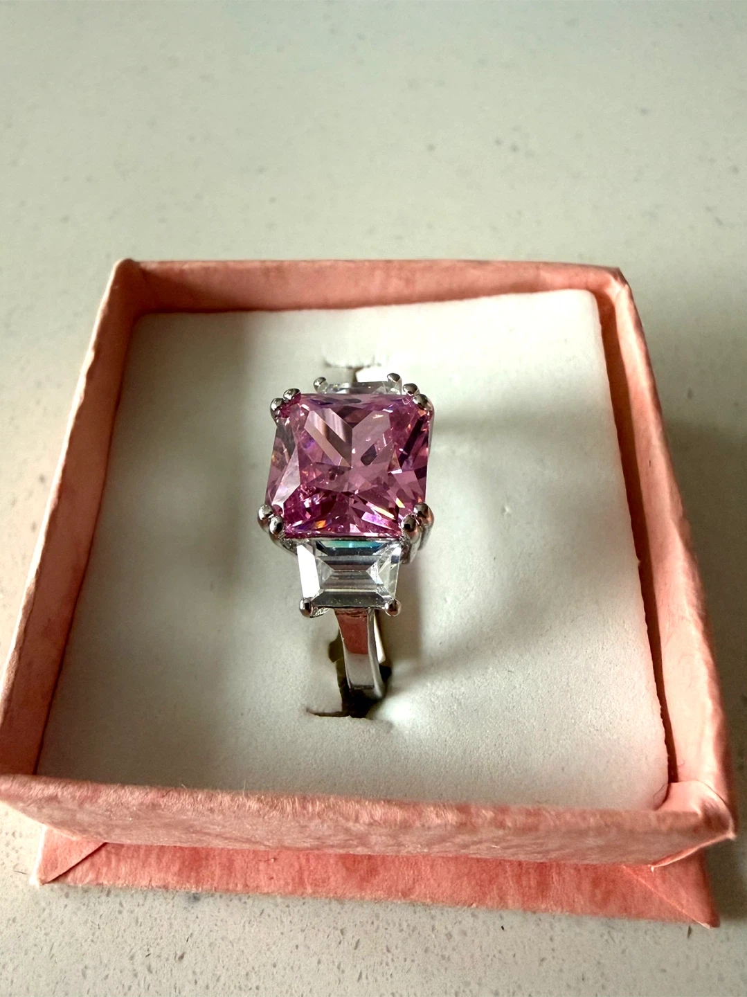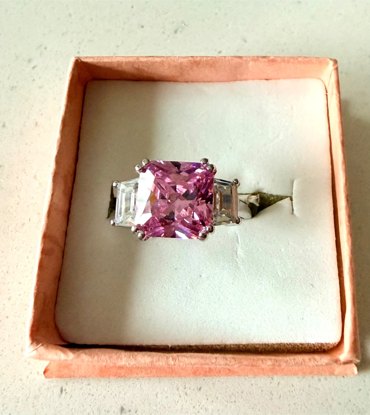 A lovely three-stone ring featuring a large princess-cut 9.49 pink Cubic Zirconia, flanked by two rectangular white gemstones. The band is Sterling silver-toned and has a marking of '925'.