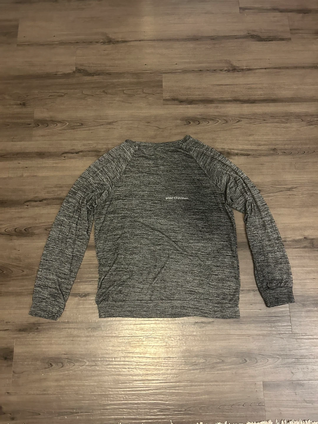 Cozy Good HYOUman long-sleeve top in a heathered grey. The front reads 'FAMILY' over 'EVERYTHING'. It’s soft, light and baggy.