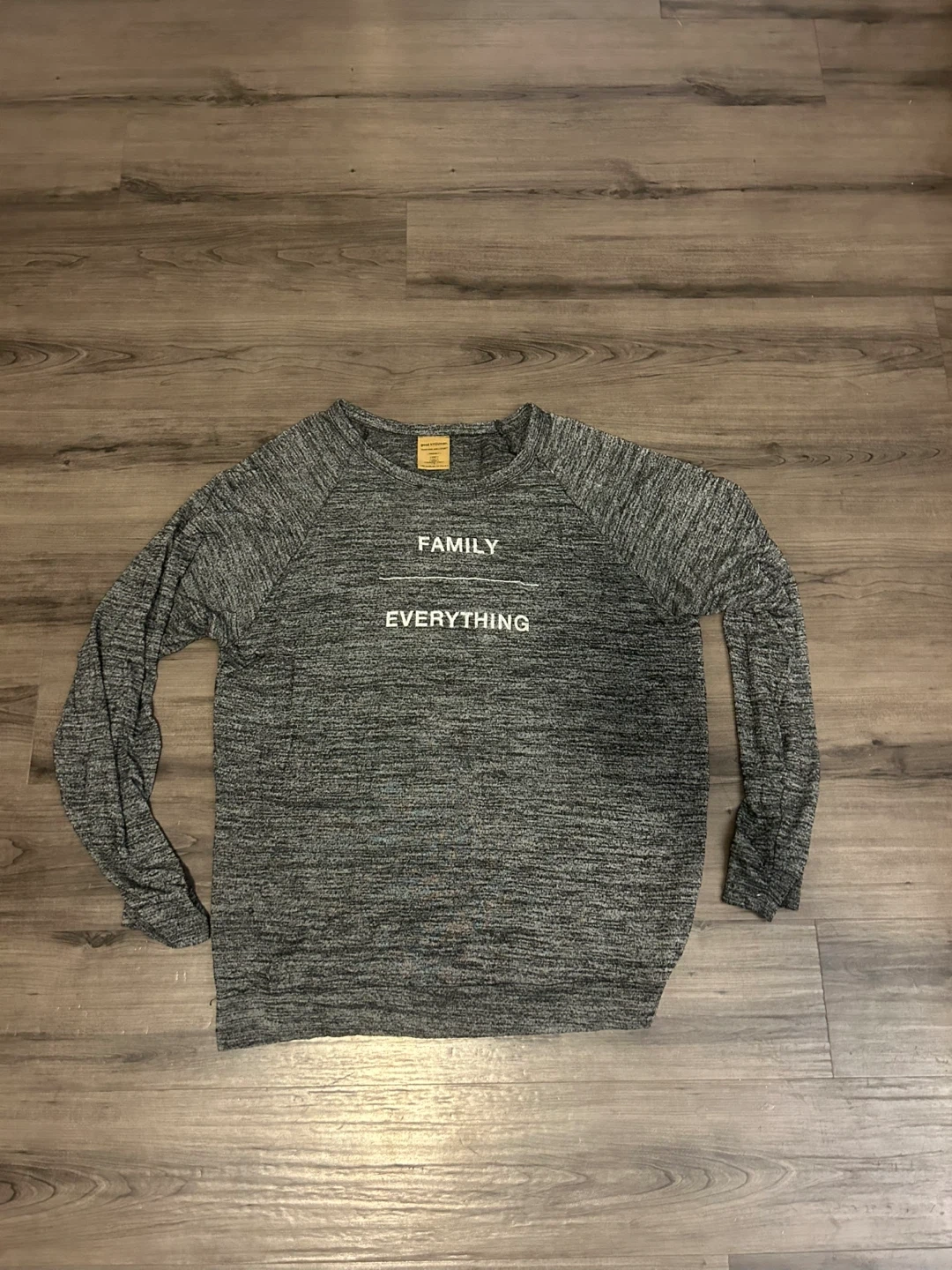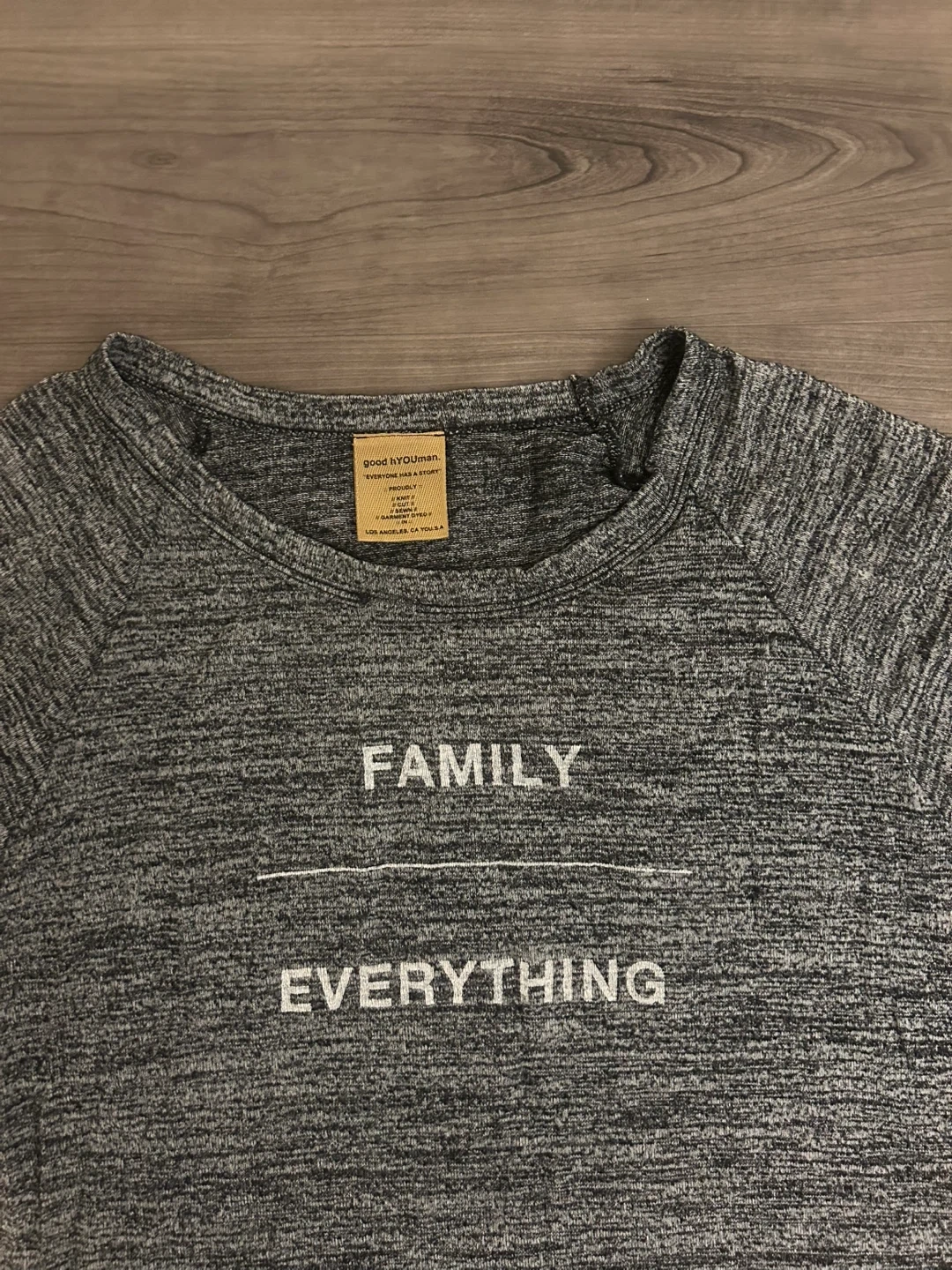 Cozy Good HYOUman long-sleeve top in a heathered grey. The front reads 'FAMILY' over 'EVERYTHING'. It’s soft, light and baggy.