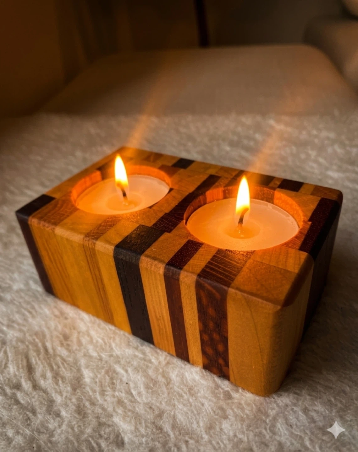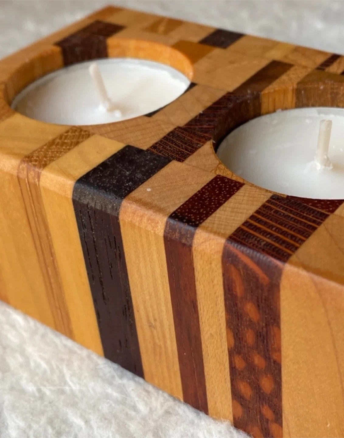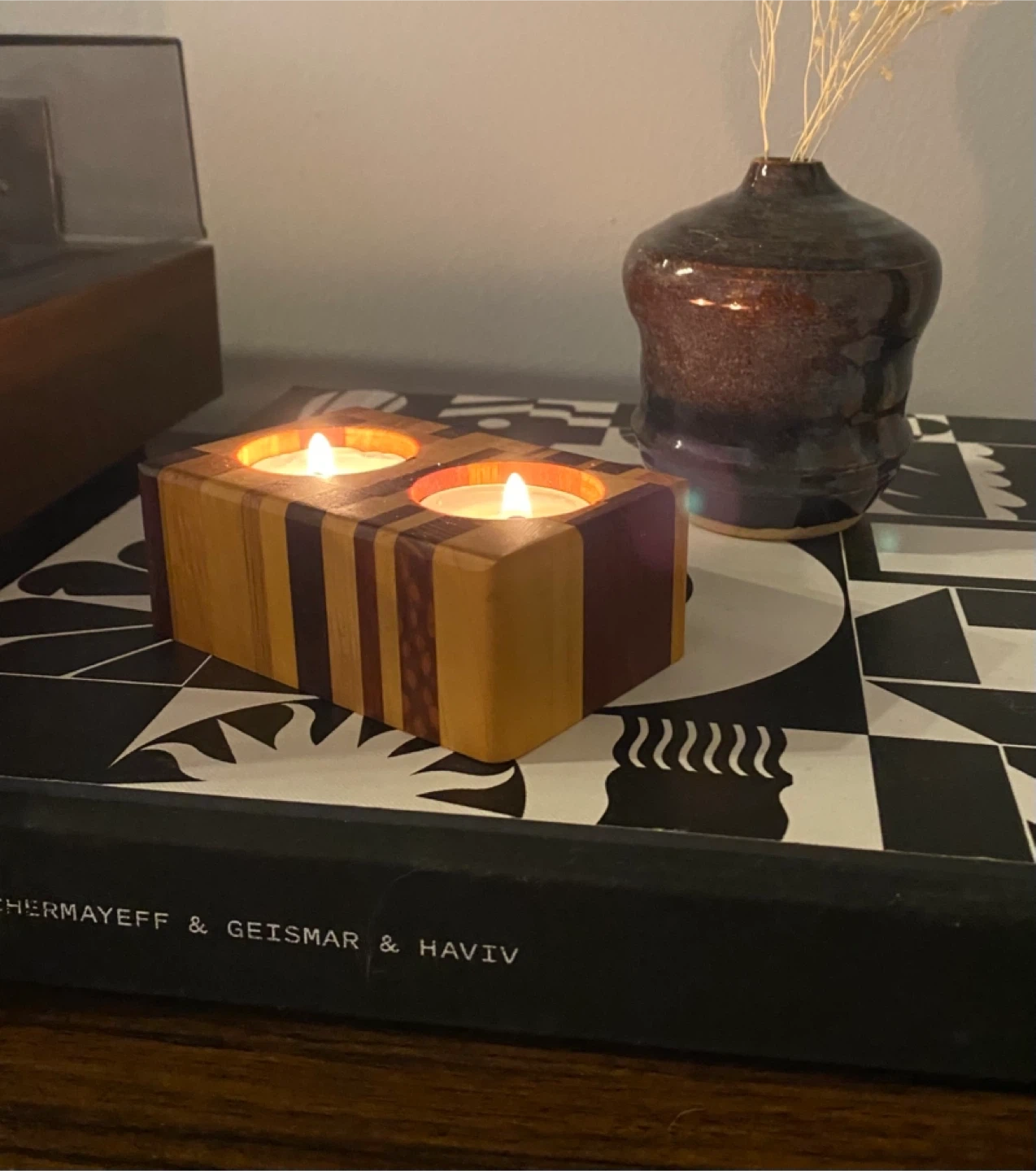 This unique wooden tealight candle holder is crafted from various wood pieces crafted to fit together by hand. The bottom is also very cool if you want to just use it as a display object.