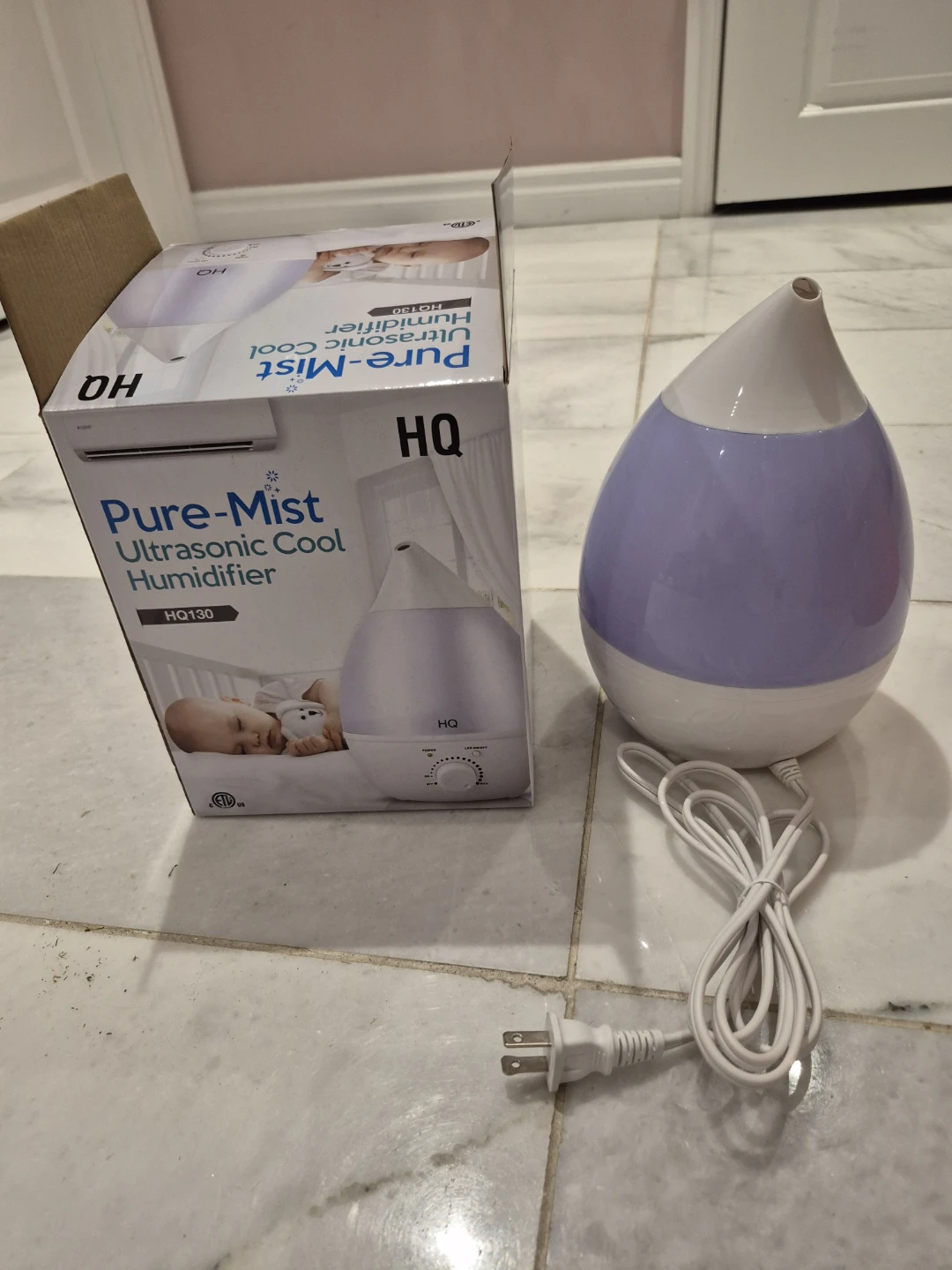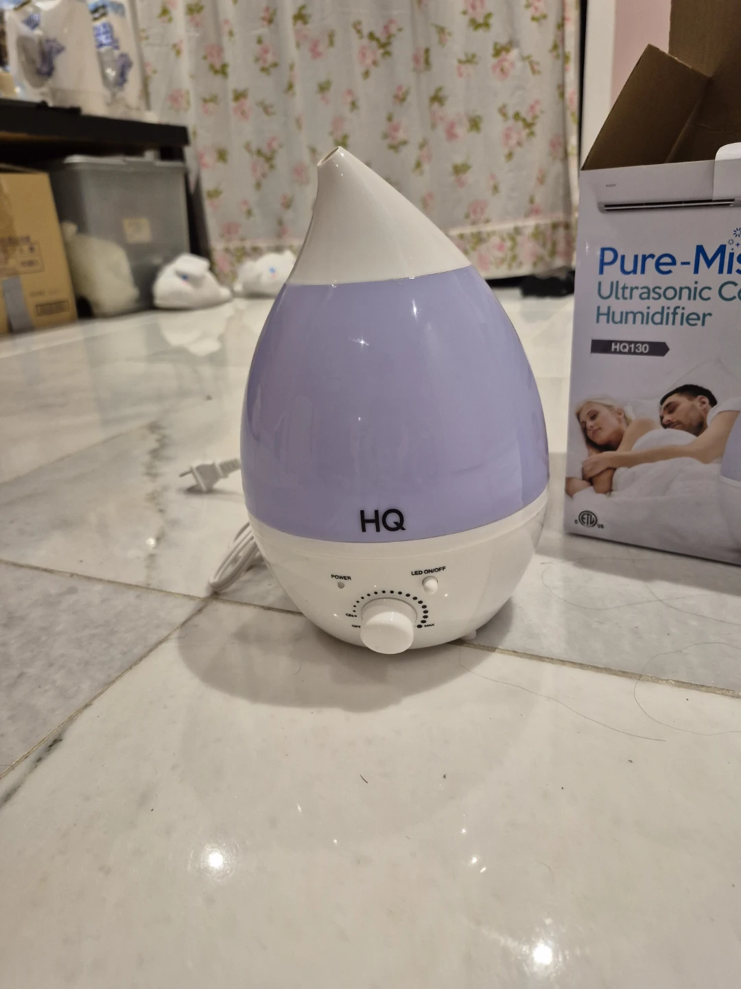 This is an HQ Pure-Mist ultrasonic cool humidifier. It's the HQ130 model. It has a dial for power and LED on/off control. Great for creating a comfortable atmosphere!
