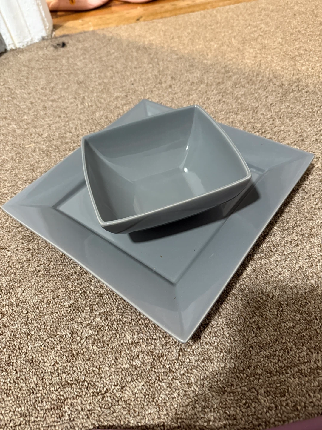 Selling a gray square dinnerware set, which includes a bowl and a plate. They are in good condition and have a modern, minimalist design. Perfect for adding a touch of elegance to your dining table!