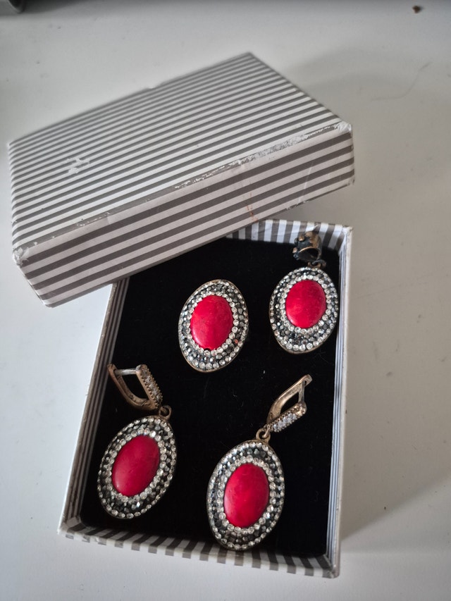 Set includes 2 earrings, 1 ring, and 1 pendant. Ring size is about a 7.5. Comes in original box. Used - Like new condition. Cash accepted.