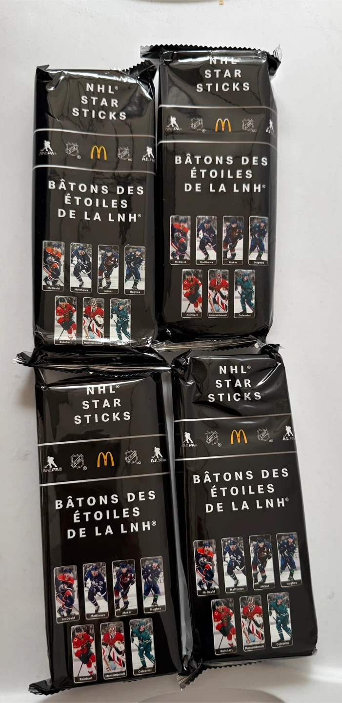 Get your hands on these NHL Star Sticks from McDonald's. Each pack features collectible hockey player cards. Perfect for any hockey fan collecting star players!