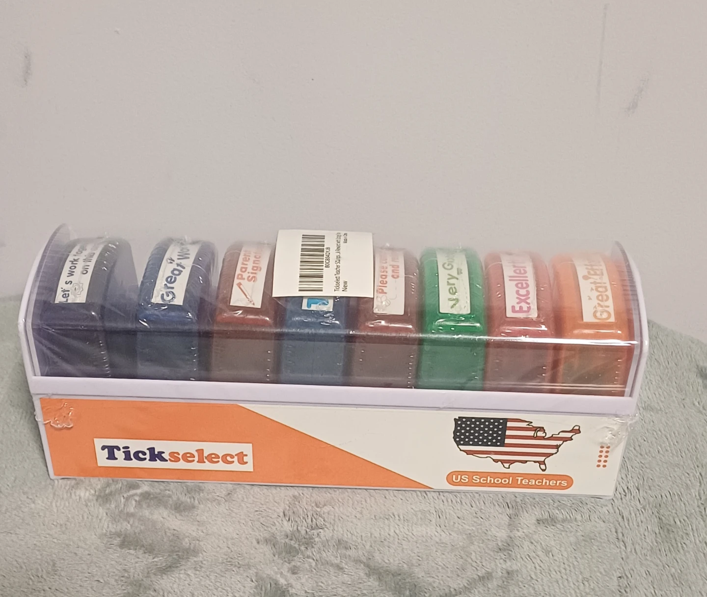 These Tickselect Teacher Stamps are brand new and ready to use! They come with a storage tray for easy organization. The stamps include messages like 'Great Work', 'Parent Signature', 'Very Good!', and 'Excellent!'