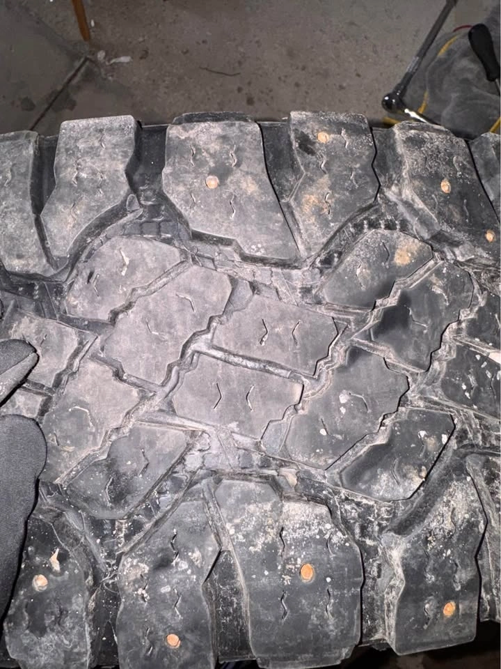Selling 2 Goodyear Wrangler Duratrac tires. They have a good amount of tread left and are both studded. One tire has a little damage on the inner tube as shown in the first picture, but it will still hold air and be good to use.