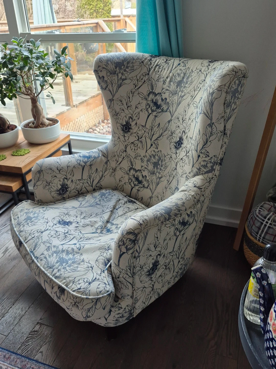 Wingback accent chair with a blue and white floral pattern. Upholstered fabric. One for $200, two for $350.