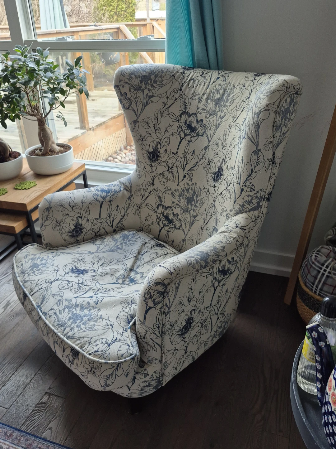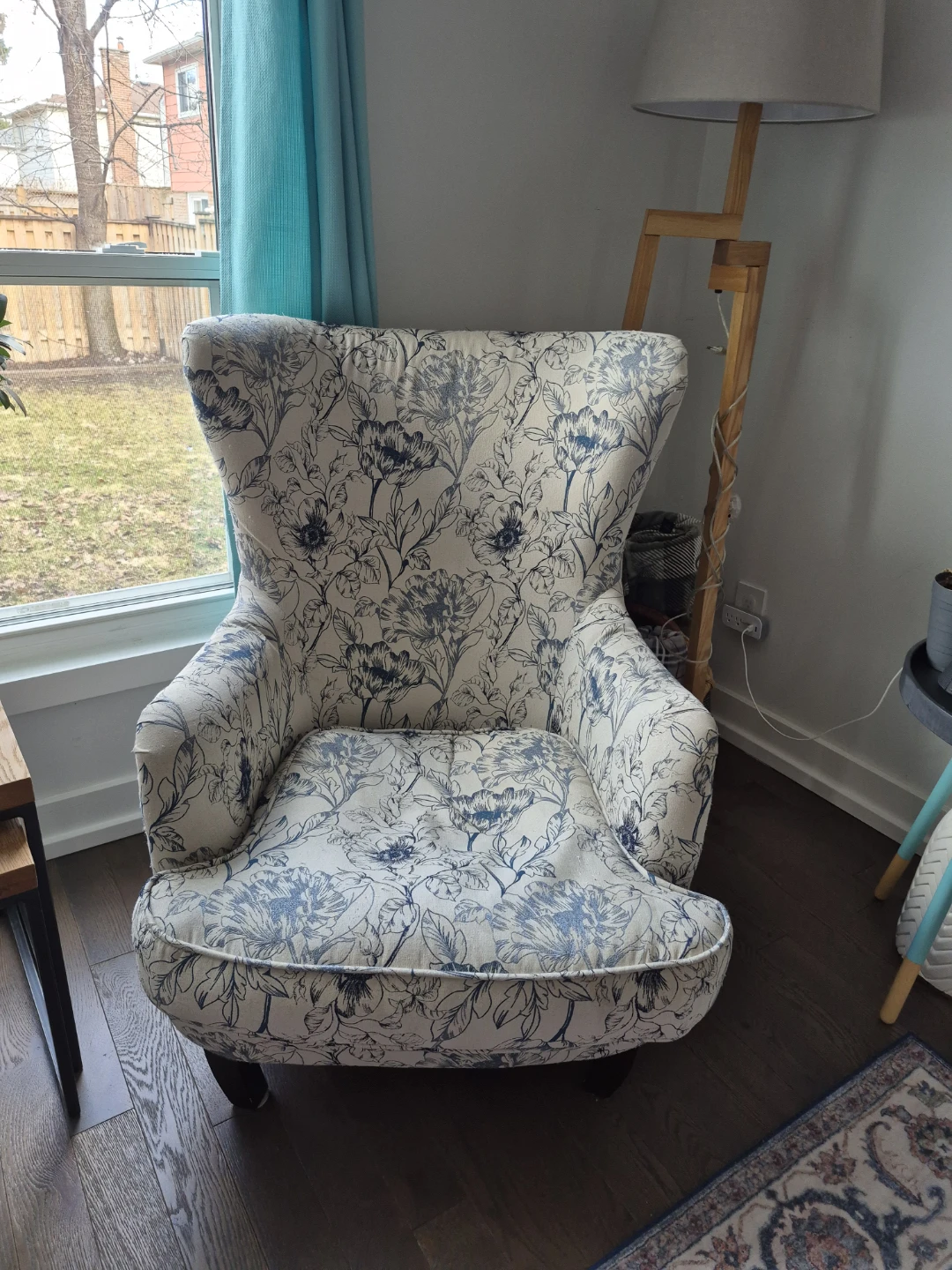 Wingback accent chair with a blue and white floral pattern. Upholstered fabric. One for $200, two for $350.