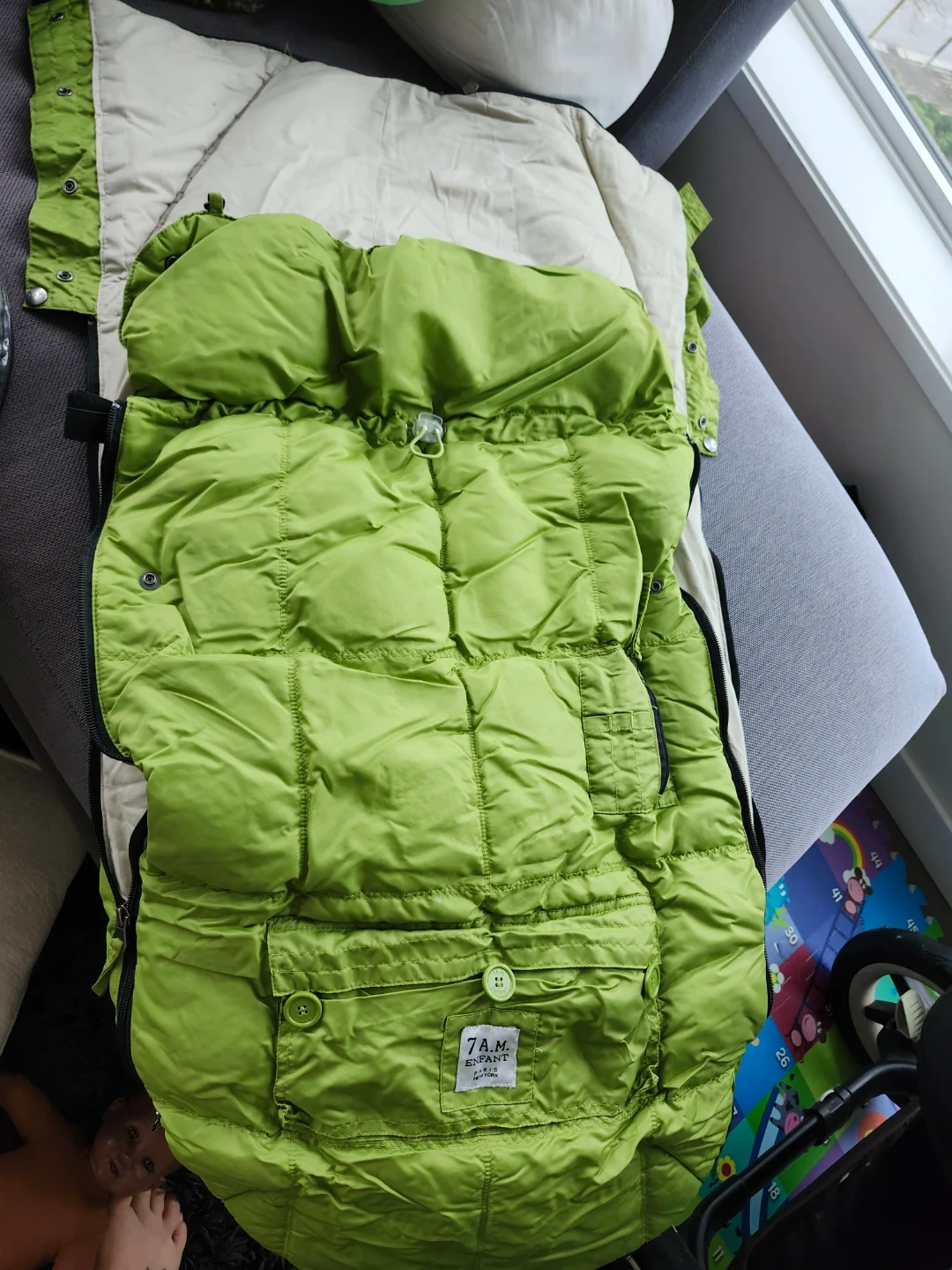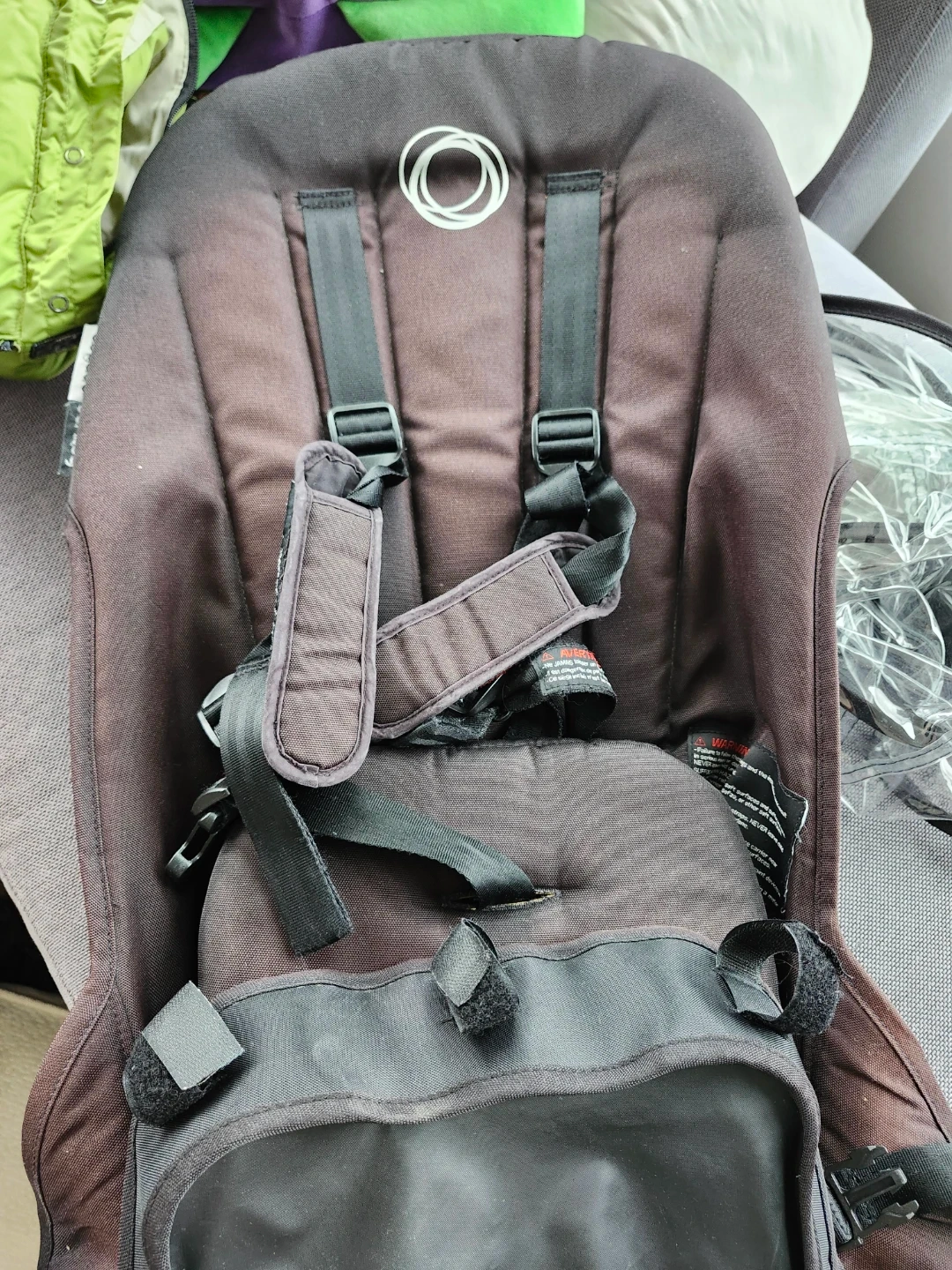 This is a Bugaboo Donkey Duo stroller in black with a fun bug print canopy. It's a versatile double stroller, perfect for families with an infant and a child. The fabric has a playful design featuring butterflies and beetles. It's a sturdy and reliable option for getting around town! It comes with a kids stroller seat but you will need to buy or make a second plank to accommodate both infant and kid. It has had at least 3 families, so it's well loved. I bought it for $500 and it was well worth it. Comes with bonus winter bunting bag.