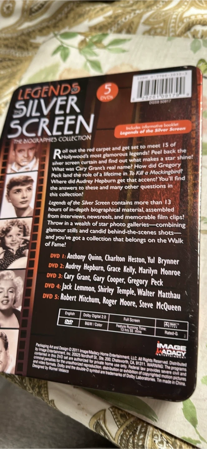 This collector's edition includes 5 DVDs featuring biographical material and memorable film clips. It contains hours of content with glamour shots and behind-the-scenes photos. Includes biographies of Anthony Quinn, Grace Kelly, Gregory Peck, and more!