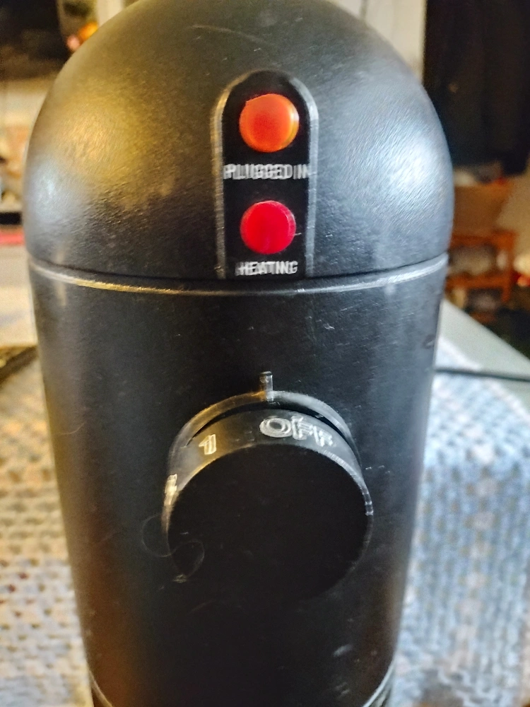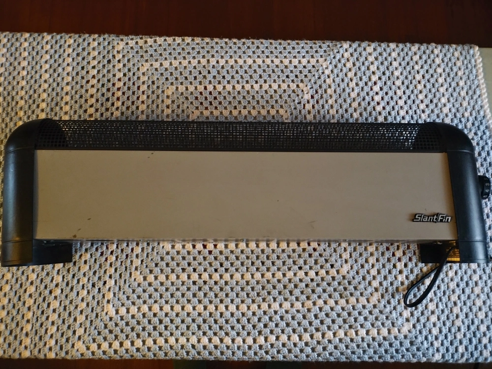 Used SlantFin Futura FE-1500 electric air heater. 1500 watts, 120 VAC. Features a simple rotary dial and indicator lights. Shows some wear.