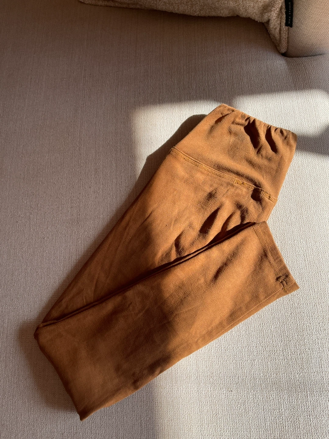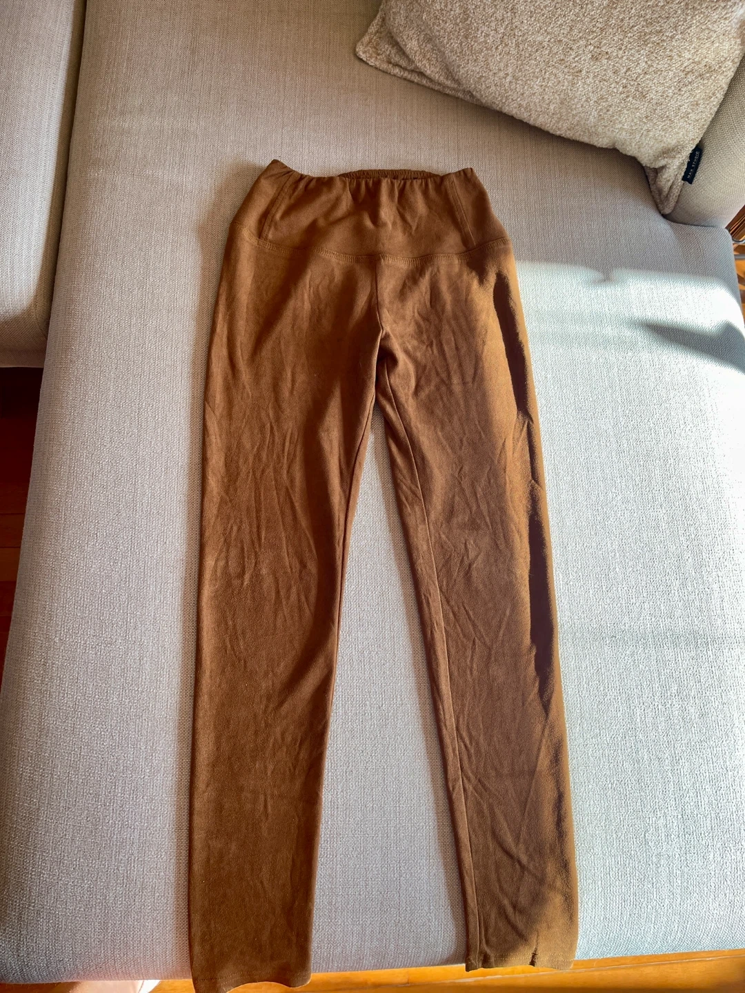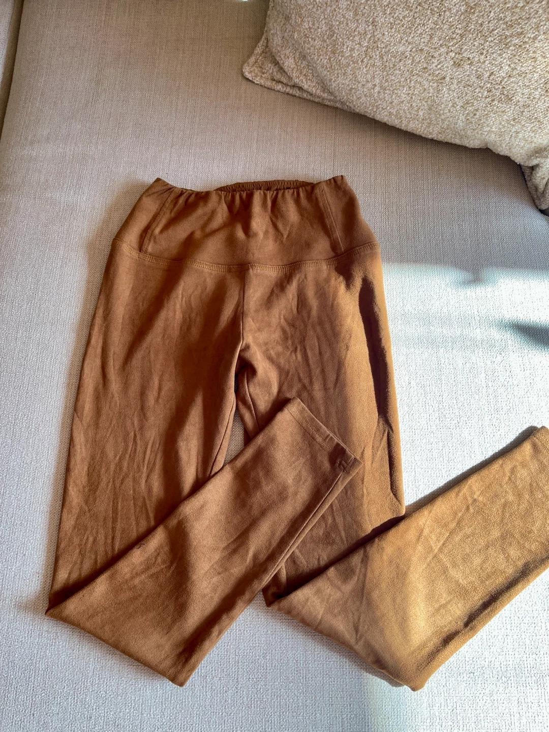 Comfortable brown leggings with a faux suede finish. High-waisted design with an elastic waistband. Great for casual wear!