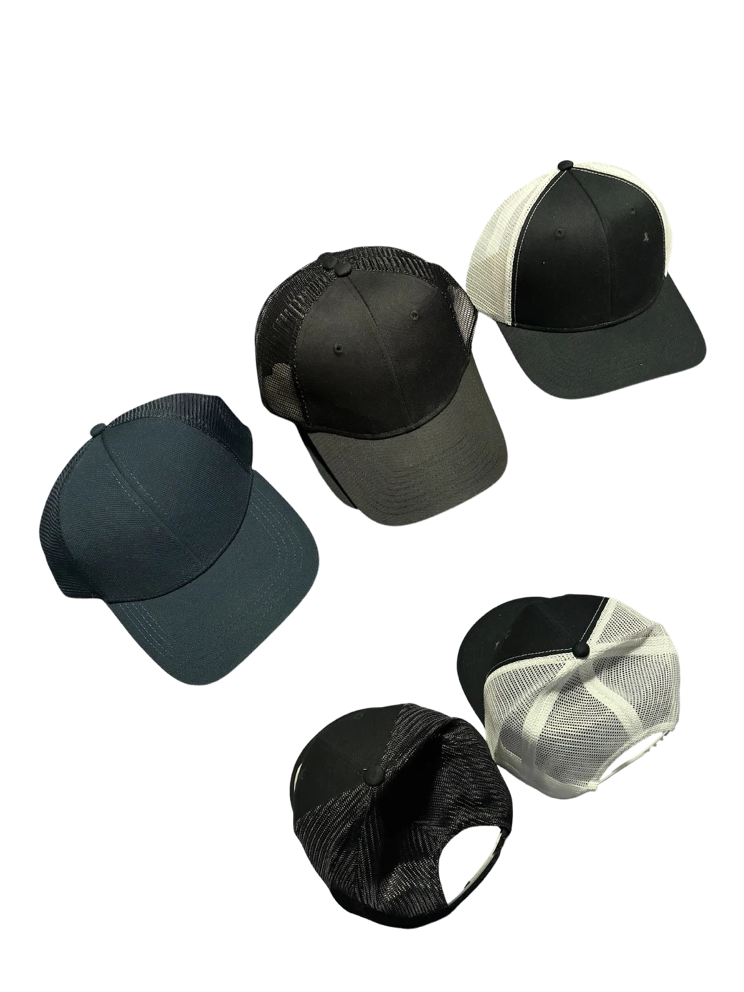 Selling a lot of five trucker-style hats. Three are black with black mesh backs, and one is black with white mesh backs. They're classic baseball cap style with adjustable snapbacks. These hats are great for everyday wear or for customization projects!