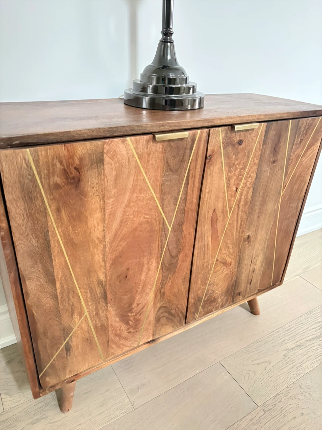 This stylish cabinet features a natural wood finish with decorative gold line inlays on the doors. It has two doors and rests on tapered wooden legs. Perfect for storing items and adding a touch of modern flair to any room!