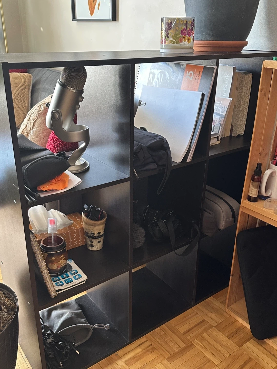 Selling a dark brown 9-cube organizer shelf. Similar style to IKEA Kallax but with thinner frames (likely Mainstays/Walmart brand).