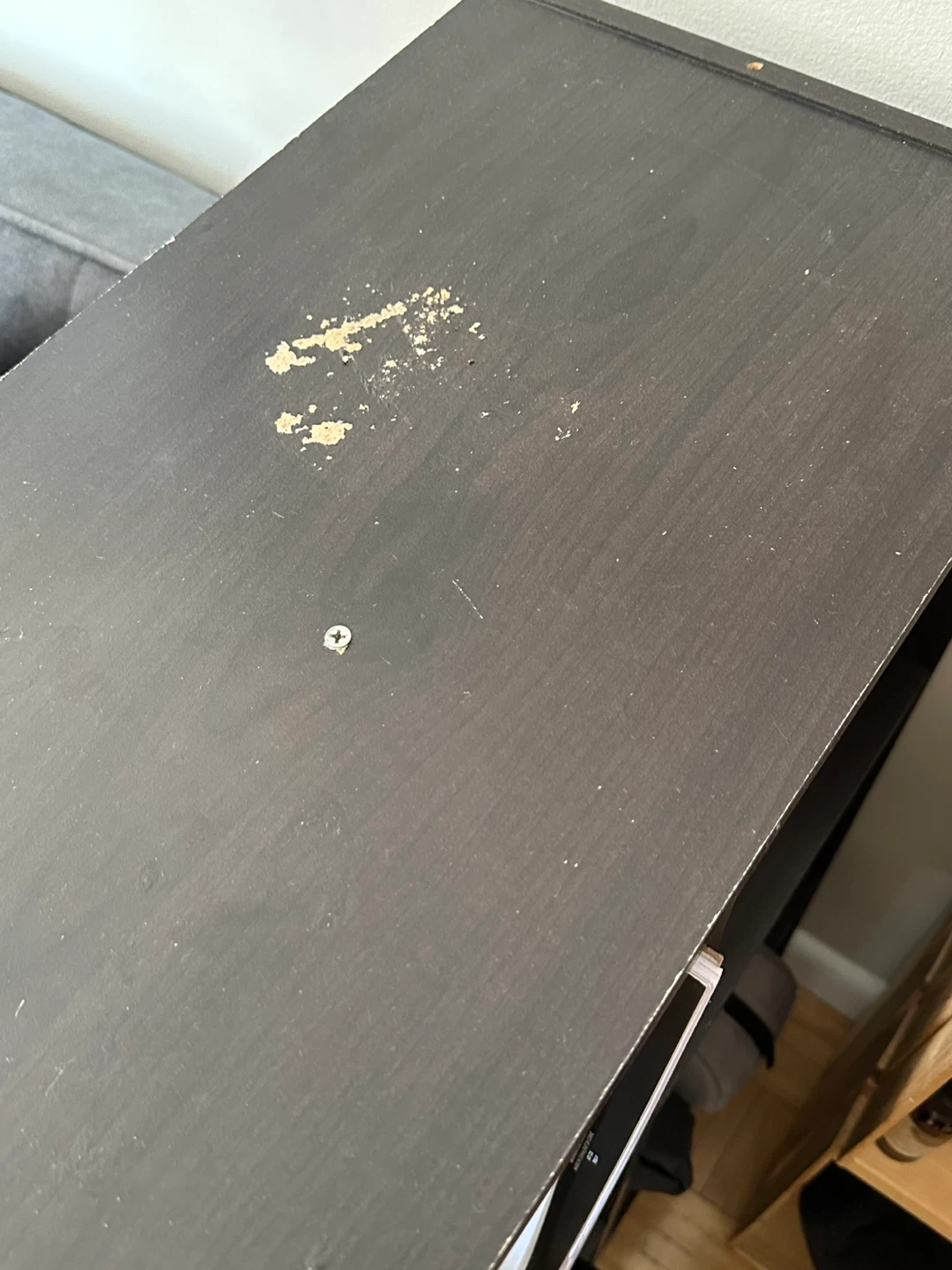 Condition: Fair condition. It has visible cosmetic wear/peeling on the top surface (see photos) and is a bit wobbly (might need tightening or corner braces).