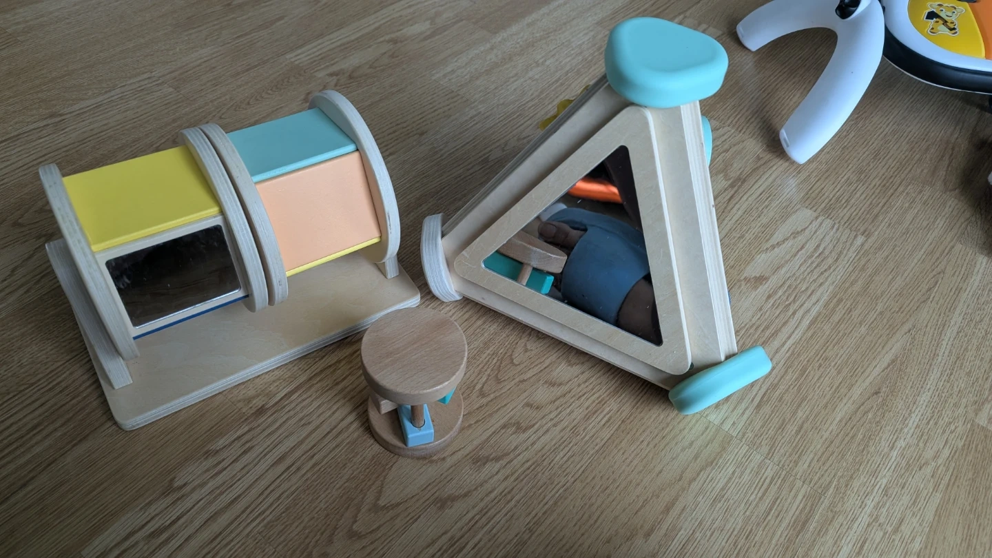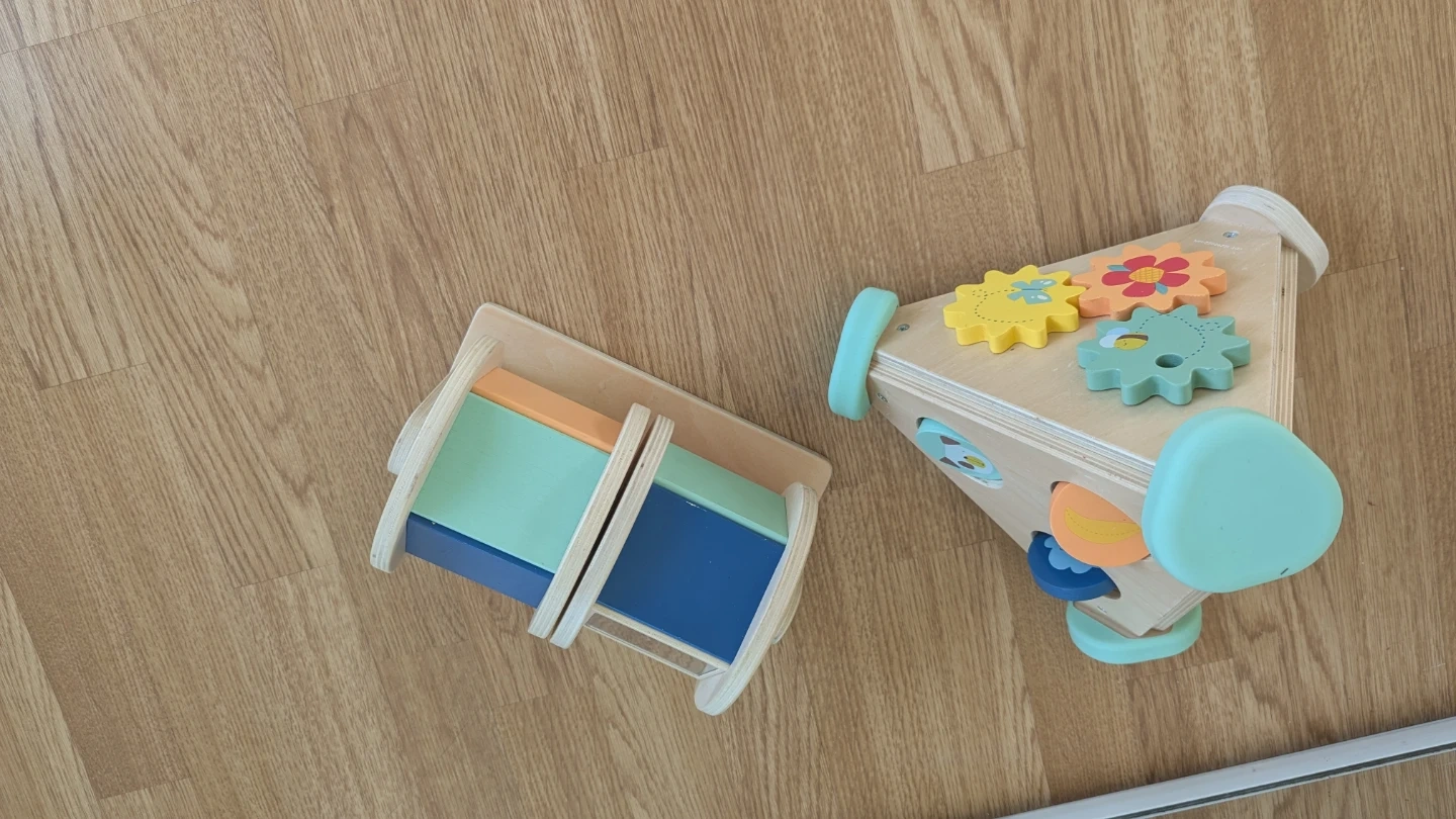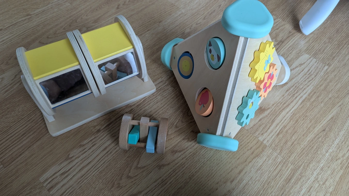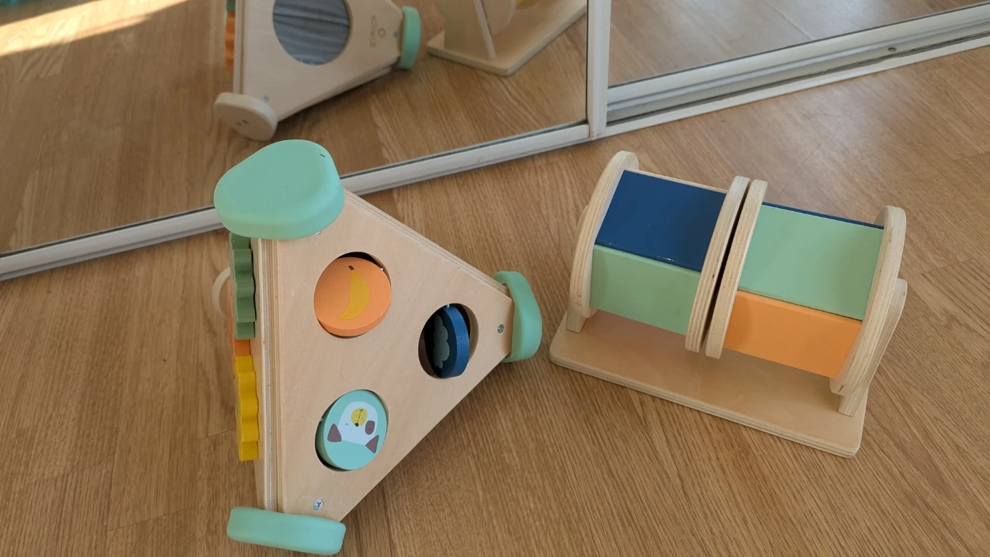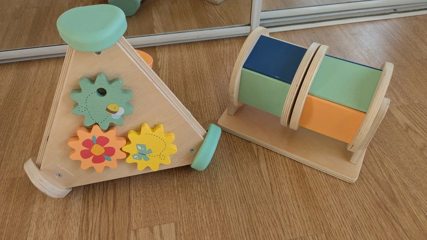 This wooden activity toy features a triangle with shape sorter inserts and gears, along with a separate roller with colourful blocks. Made of wood with pastel accents.