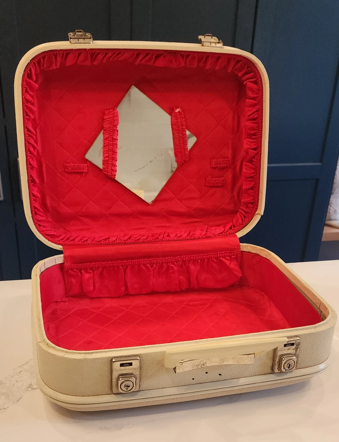Selling a vintage overnight vanity case with a cream-colored exterior and a vibrant red quilted interior. It features a small mirror inside. There are no keys but front locks open and close perfectly.